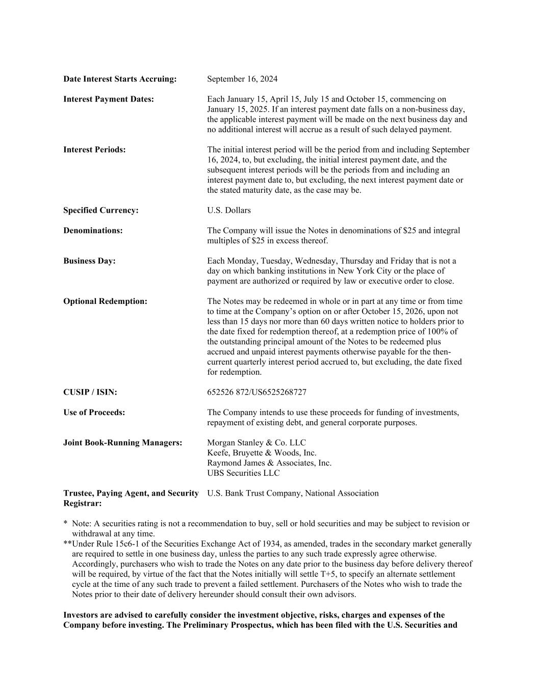 Date Interest Starts Accruing: September 16, 2024 Interest Payment Dates: Each January 15, April 15, July 15 and October 15, commencing on January 15, 2025. If an interest payment date falls on a non-business day, the applicable interest payment will be made on the next business day and no additional interest will accrue as a result of such delayed payment. Interest Periods: The initial interest period will be the period from and including September 16, 2024, to, but excluding, the initial interest payment date, and the subsequent interest periods will be the periods from and including an interest payment date to, but excluding, the next interest payment date or the stated maturity date, as the case may be. Specified Currency: U.S. Dollars Denominations: The Company will issue the Notes in denominations of $25 and integral multiples of $25 in excess thereof. Business Day: Each Monday, Tuesday, Wednesday, Thursday and Friday that is not a day on which banking institutions in New York City or the place of payment are authorized or required by law or executive order to close. Optional Redemption: The Notes may be redeemed in whole or in part at any time or from time to time at the Company’s option on or after October 15, 2026, upon not less than 15 days nor more than 60 days written notice to holders prior to the date fixed for redemption thereof, at a redemption price of 100% of the outstanding principal amount of the Notes to be redeemed plus accrued and unpaid interest payments otherwise payable for the then- current quarterly interest period accrued to, but excluding, the date fixed for redemption. CUSIP / ISIN: 652526 872/US6525268727 Use of Proceeds: The Company intends to use these proceeds for funding of investments, repayment of existing debt, and general corporate purposes. Joint Book-Running Managers: Morgan Stanley & Co. LLC Keefe, Bruyette & Woods, Inc. Raymond James & Associates, Inc. UBS Securities LLC Trustee, Paying Agent, and Security Registrar: U.S. Bank Trust Company, National Association * Note: A securities rating is not a recommendation to buy, sell or hold securities and may be subject to revision or withdrawal at any time. **Under Rule 15c6-1 of the Securities Exchange Act of 1934, as amended, trades in the secondary market generally are required to settle in one business day, unless the parties to any such trade expressly agree otherwise. Accordingly, purchasers who wish to trade the Notes on any date prior to the business day before delivery thereof will be required, by virtue of the fact that the Notes initially will settle T+5, to specify an alternate settlement cycle at the time of any such trade to prevent a failed settlement. Purchasers of the Notes who wish to trade the Notes prior to their date of delivery hereunder should consult their own advisors. Investors are advised to carefully consider the investment objective, risks, charges and expenses of the Company before investing. The Preliminary Prospectus, which has been filed with the U.S. Securities and