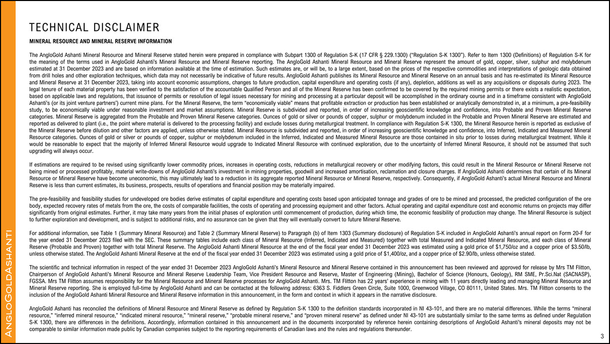 will actually occur. For a discussion of such risk factors, refer to AngloGold Ashanti’s annual report on Form 20-F for the year ended 31 December 2023 filed with the United States Securities and Exchange Commission (“SEC”). These factors are