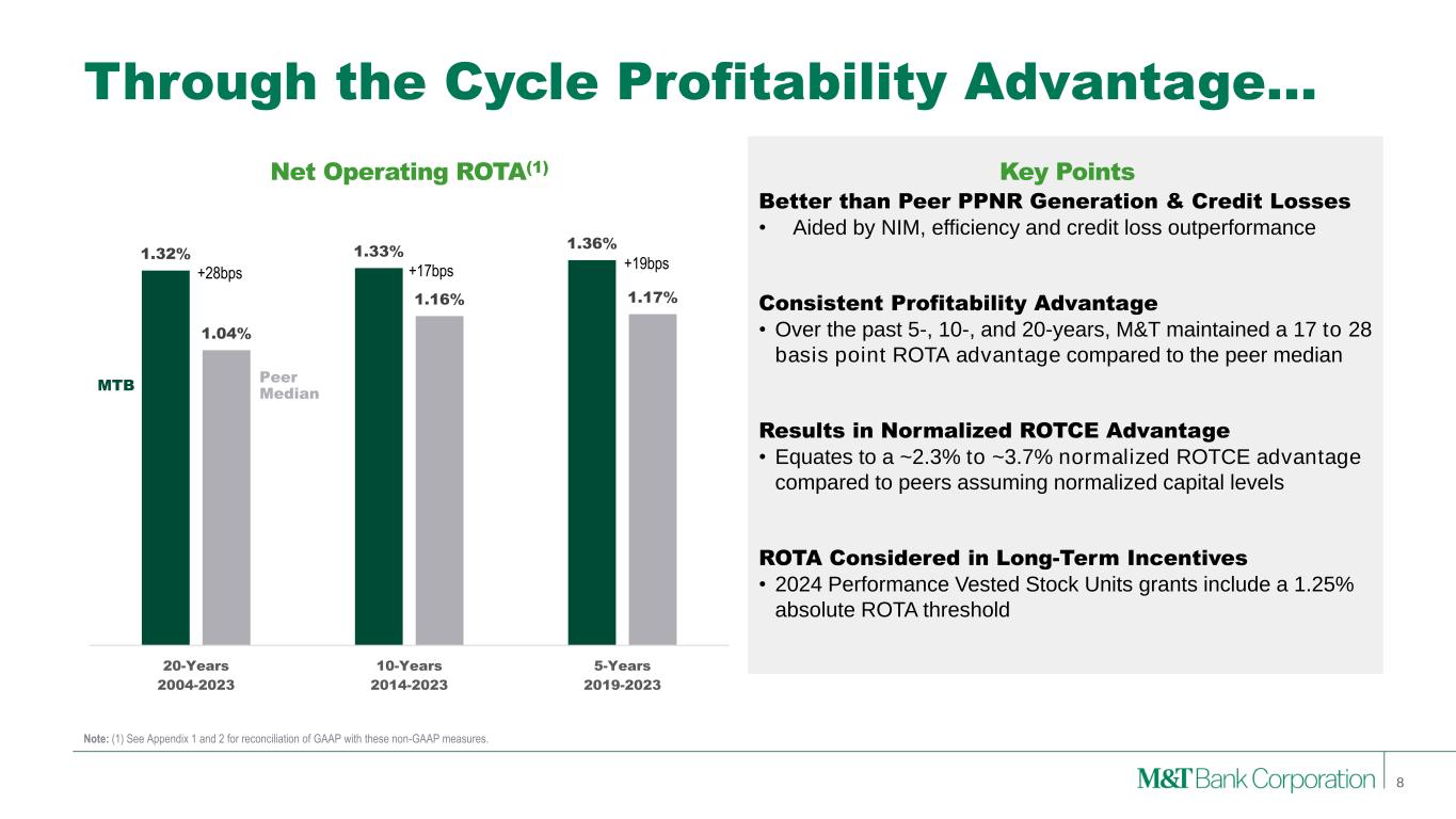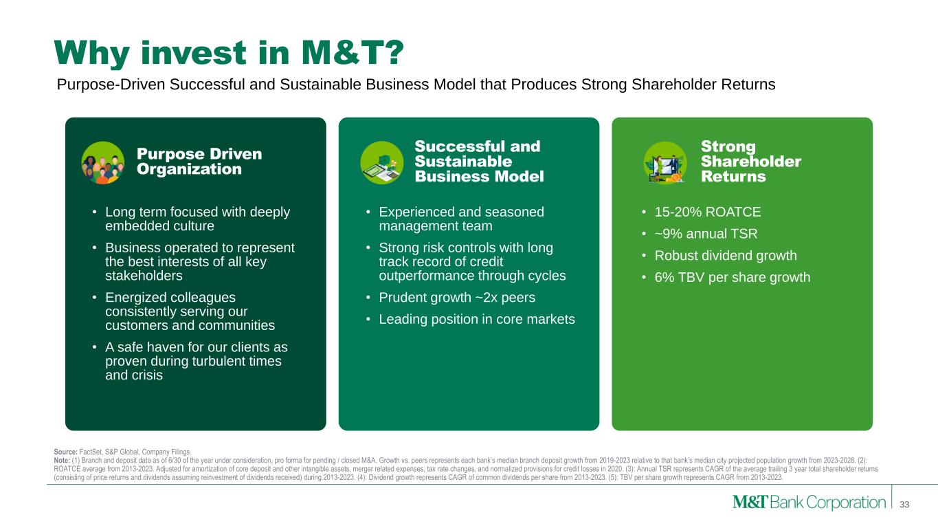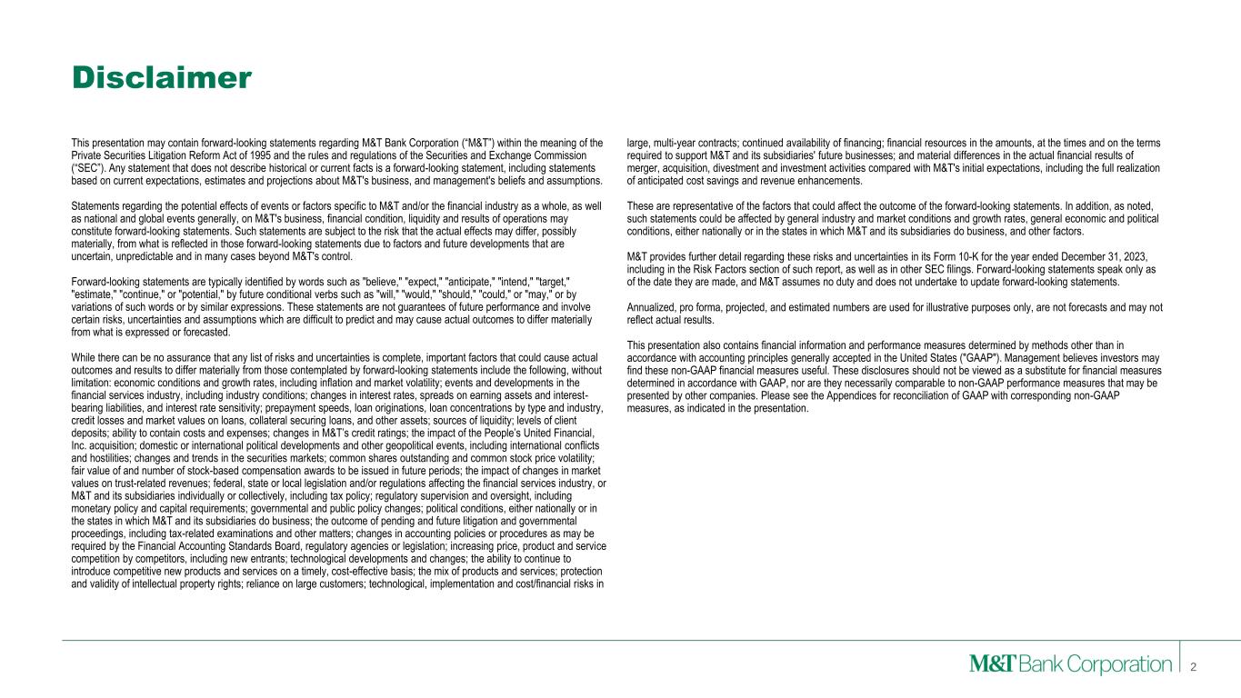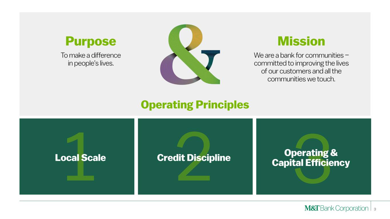 Disclaimer This presentation may contain forward-looking statements regarding M&T Bank Corporation (“M&T”) within the meaning of the Private Securities Litigation Reform Act of 1995 and the rules and regulations of the Securities and Exchange Commission (“SEC”). Any statement that does not describe historical or current facts is a forward-looking statement, including statements based on current expectations, estimates and projections about M&T's business, and management's beliefs and assumptions. Statements regarding the potential effects of events or factors specific to M&T and/or the financial industry as a whole, as well as national and global events generally, on M&T's business, financial condition, liquidity and results of operations may constitute forward-looking statements. Such statements are subject to the risk that the actual effects may differ, possibly materially, from what is reflected in those forward-looking statements due to factors and future developments that are uncertain, unpredictable and in many cases beyond M&T's control. Forward-looking statements are typically identified by words such as "believe," "expect," "anticipate," "intend," "target," "estimate," "continue," or "potential," by future conditional verbs such as "will," "would," "should," "could," or "may," or by variations of such words or by similar expressions. These statements are not guarantees of future performance and involve certain risks, uncertainties and assumptions which are difficult to predict and may cause actual outcomes to differ materially from what is expressed or forecasted. While there can be no assurance that any list of risks and uncertainties is complete, important factors that could cause actual outcomes and results to differ materially from those contemplated by forward-looking statements include the following, without limitation: economic conditions and growth rates, including inflation and market volatility; events and developments in the financial services industry, including industry conditions; changes in interest rates, spreads on earning assets and interest- bearing liabilities, and interest rate sensitivity; prepayment speeds, loan originations, loan concentrations by type and industry, credit losses and market values on loans, collateral securing loans, and other assets; sources of liquidity; levels of client deposits; ability to contain costs and expenses; changes in M&T’s credit ratings; the impact of the People’s United Financial, Inc. acquisition; domestic or international political developments and other geopolitical events, including international conflicts and hostilities; changes and trends in the securities markets; common shares outstanding and common stock price volatility; fair value of and number of stock-based compensation awards to be issued in future periods; the impact of changes in market values on trust-related revenues; federal, state or local legislation and/or regulations affecting the financial services industry, or M&T and its subsidiaries individually or collectively, including tax policy; regulatory supervision and oversight, including monetary policy and capital requirements; governmental and public policy changes; political conditions, either nationally or in the states in which M&T and its subsidiaries do business; the outcome of pending and future litigation and governmental proceedings, including tax-related examinations and other matters; changes in accounting policies or procedures as may be required by the Financial Accounting Standards Board, regulatory agencies or legislation; increasing price, product and service competition by competitors, including new entrants; technological developments and changes; the ability to continue to introduce competitive new products and services on a timely, cost-effective basis; the mix of products and services; protection and validity of intellectual property rights; reliance on large customers; technological, implementation and cost/financial risks in large, multi-year contracts; continued availability of financing; financial resources in the amounts, at the times and on the terms required to support M&T and its subsidiaries' future businesses; and material differences in the actual financial results of merger, acquisition, divestment and investment activities compared with M&T's initial expectations, including the full realization of anticipated cost savings and revenue enhancements. These are representative of the factors that could affect the outcome of the forward-looking statements. In addition, as noted, such statements could be affected by general industry and market conditions and growth rates, general economic and political conditions, either nationally or in the states in which M&T and its subsidiaries do business, and other factors. M&T provides further detail regarding these risks and uncertainties in its Form 10-K for the year ended December 31, 2023, including in the Risk Factors section of such report, as well as in other SEC filings. Forward-looking statements speak only as of the date they are made, and M&T assumes no duty and does not undertake to update forward-looking statements. Annualized, pro forma, projected, and estimated numbers are used for illustrative purposes only, are not forecasts and may not reflect actual results. This presentation also contains financial information and performance measures determined by methods other than in accordance with accounting principles generally accepted in the United States ("GAAP"). Management believes investors may find these non-GAAP financial measures useful. These disclosures should not be viewed as a substitute for financial measures determined in accordance with GAAP, nor are they necessarily comparable to non-GAAP performance measures that may be presented by other companies. Please see the Appendices for reconciliation of GAAP with corresponding non-GAAP measures, as indicated in the presentation. 2