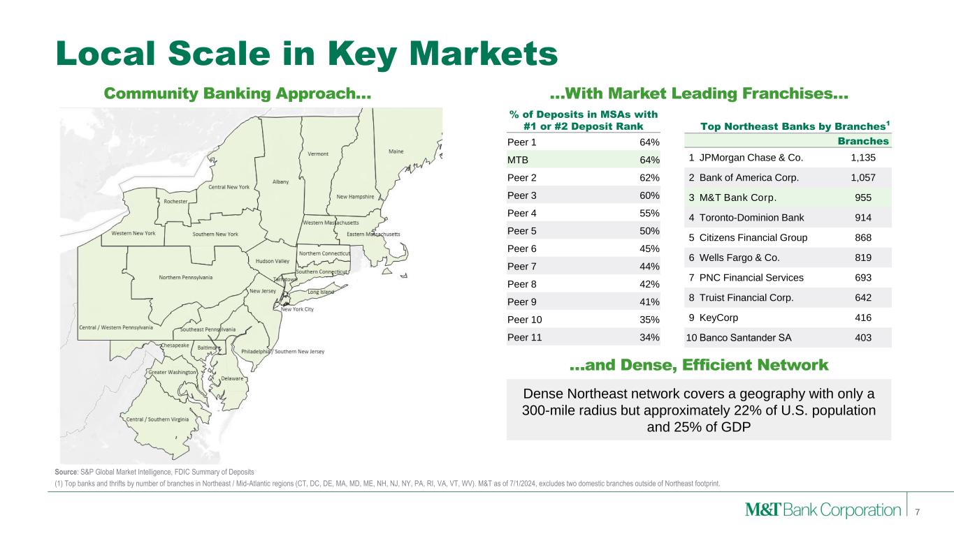 Diversified Business Model Experienced teams provide a wide-range of credit, liquidity and capital markets solutions to meet our customer needs, delivered through a local engagement model and industry expertise on a national scale. Strategically built for the communities in which we operate. High-touch, local sales and service model provides a low-cost, stable funding base, a long-tenured customer base, and the shared benefits of community growth and development. 6 Institutional Services Expanding on strength of its reputation for industry leading service and strong reputation with existing network of deal influencers. Wealth Management Provides planning-led advice, leveraging Wilmington Trust’s national capabilities and the enhanced experience that LPL brings, to grow customers across the wealth continuum. Note: ‘All Other’ segment not shown above. Represents -6% (-$219 million) of NII, 4% ($50 million) of fees, -4% (-$169 million) of revenue, <0.5% (<$0.2 billion) of loans and 7% ($12 billion) of deposits. (1) Net interest income is the difference between actual taxable-equivalent interest earned on assets and interest paid on liabilities by a segment and a funding charge (credit) based on the Company’s internal funds transfer pricing methodology. (2) See Appendix 1 and 2 for reconciliation of GAAP with these non-GAAP measures. Commercial Bank Retail Bank Institutional Services & Wealth Management Net Interest Income1 $1.1 billion 32% $2.2 billion 63% $0.4 billion 11% $3.4 billion Fee Income $0.3 billion 27% $0.4 billion 34% $0.4 billion 34% $1.2 billion Revenue $1.4 billion 31% $2.6 billion 56% $0.8 billion 17% $4.6 billion Average Loans $80 billion 60% $50 billion 38% $3 billion 3% $134 billion Average Deposits $43 billion 26% $92 billion 56% $17 billion 10% $164 billion ROTA2 1.01% 3.49% 14.96% 1.20% ROTCE2 11.4% 39.2% 95.3% 14.0% Efficiency Ratio2 49.7% 46.8% 52.6% 58.0% 1H24, % of Total M&T Total M&T