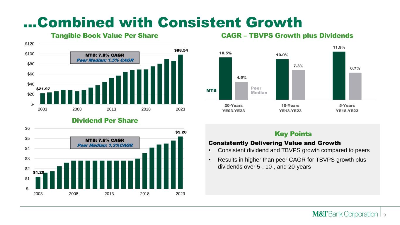 Through the Cycle Profitability Advantage… 8 Note: (1) See Appendix 1 and 2 for reconciliation of GAAP with these non-GAAP measures. 1.32% 1.33% 1.36% 1.04% 1.16% 1.17% 20-Years 2004-2023 10-Years 2014-2023 5-Years 2019-2023 Net Operating ROTA(1) Better than Peer PPNR Generation & Credit Losses • Aided by NIM, efficiency and credit loss outperformance Consistent Profitability Advantage • Over the past 5-, 10-, and 20-years, M&T maintained a 17 to 28 basis point ROTA advantage compared to the peer median Results in Normalized ROTCE Advantage • Equates to a ~2.3% to ~3.7% normalized ROTCE advantage compared to peers assuming normalized capital levels ROTA Considered in Long-Term Incentives • 2024 Performance Vested Stock Units grants include a 1.25% absolute ROTA threshold +28bps +17bps +19bps Key Points MTB Peer Median