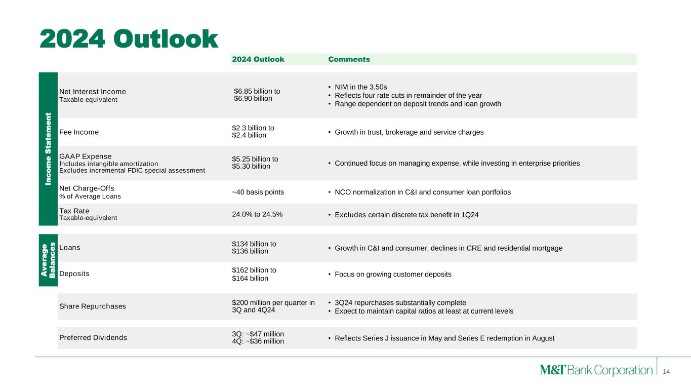 3Q 2024 Trends Average Loans Flat and Deposits Declined QTD Expense Reflects Continued Discipline while Investing in Key Priorities Revenues Trending Expectations Capital and Asset Quality Trending Expectations • Through August QTD, average deposits down from the linked quarter to $160.7 billion • Through August QTD, average noninterest-bearing deposits down $1.6 billion from the linked quarter to $46.1 billion, reflecting some continued mix shift and expected decline in trust demand deposits • Interest-bearing deposit cost has flattened out • Through August QTD, average loans flat from linked quarter at $134.6 billion, driven by C&I and Consumer and continued reduction in CRE • Smaller balance sheet with QTD average earnings assets of $191.2 billion • GAAP expense (including intangible amortization) of $1.295 billion - $1.315 billion • Reflects timing of investment spend across our enterprise priorities • Taxable-equivalent net interest income of $1.725 billion +/-, with high 3.50s NIM • Noninterest income, excluding securities gains / losses, of $585 million - $600 million with strength in Mortgage and Trust • $200 million in share repurchases for 3Q24 substantially complete • Expect modest increase in CET1 ratio • Net charge-offs expected to be lumpy (+/-) quarter-to-quarter, but full year expectations of ~40 bps 13