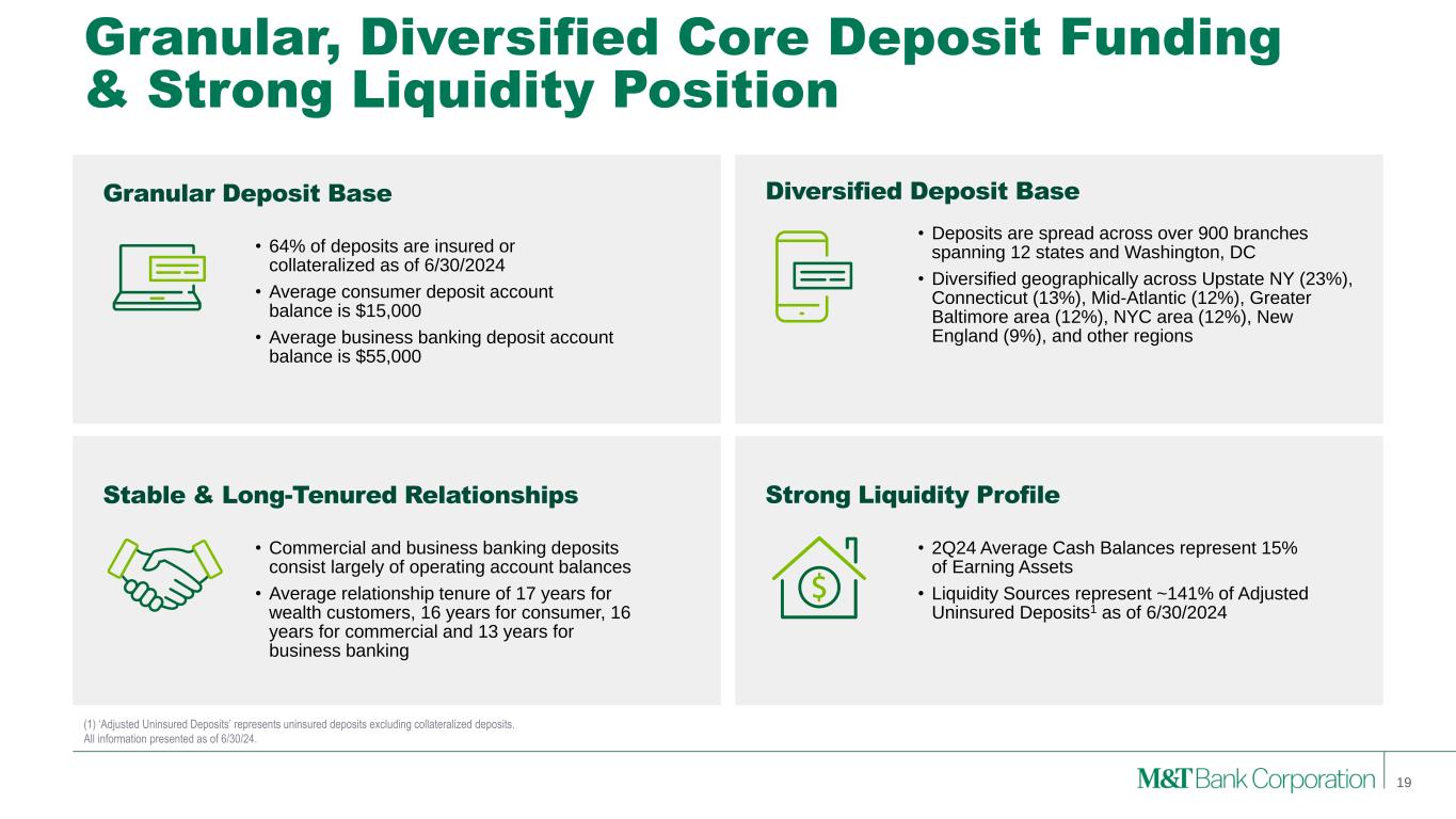 Fee Income Diversification 18 25% 29% 33% MTB Peer Median • Potential rate-related upside in commercial mortgage banking, loan fees, and capital markets given the potentially higher volume • Additional potential rate-related benefit in other areas including derivatives, advisory fees, and commercial deposit service charges • Mortgage fees diversified by servicing / originations and commercial / residential • Total noninterest income of 25% of total revenue is lower than peers through 1H24 as a result of top NIM; 29% of total revenue assuming M&T had peer median NIM Reported MTB Assuming Median NIM Noninterest Income Mix(1) 1H24 Noninterest Income % of Total Revenue(2) 1H24 33% 21% 13% 5% 8% 7% 12% Trust and Brokerage Mortgage Residential Mortgage Commercial Service Charges LOC & Credit- Related Credit Card & Merchant Other 1H24 Noninterest Income(1) $1.2B Diversified Fee Businesses Perform Across Cycles (1) Noninterest income excluding securities gains and losses (2) Noninterest income excluding securities gains and losses. Total revenue includes taxable-equivalent NII and noninterest income excluding securities gains and losses. Peer median excludes one peer due to significant nonrecurring gains.