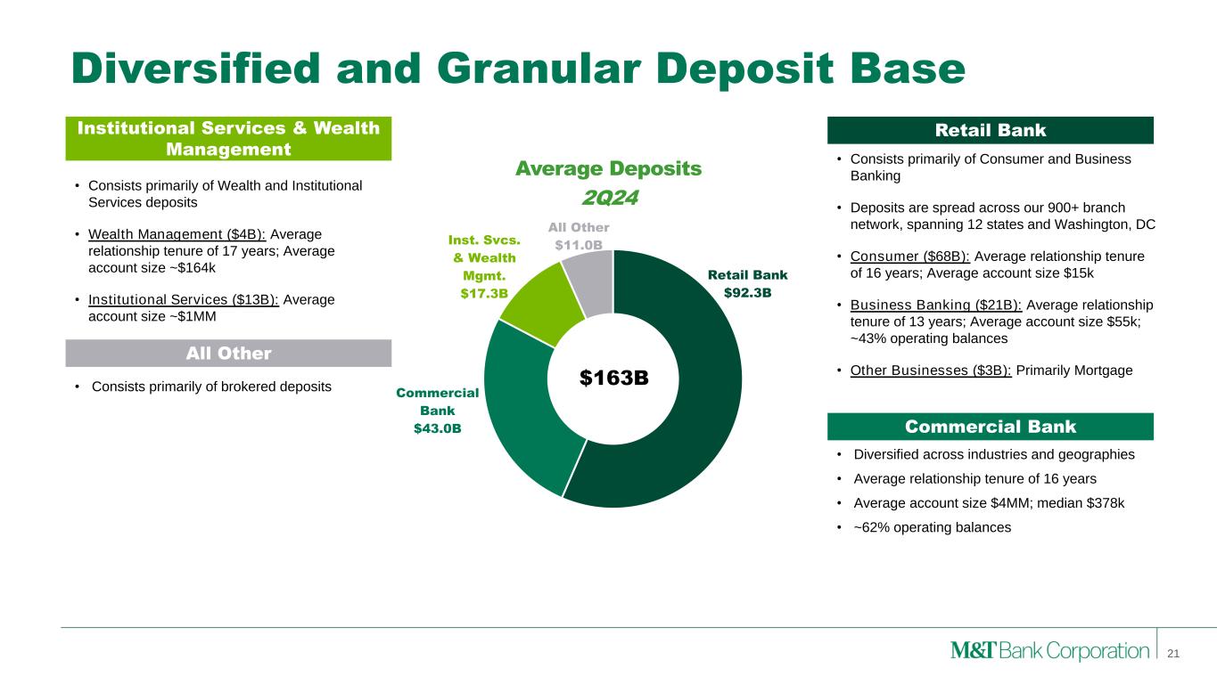 0.09% 0.08% 0.07% 0.06% 0.04% 0.03% 0.03% 0.02% 0.01% -0.03% -0.03% -0.05% Peer 11 Peer 10 Peer 9 Peer 8 Peer 7 Peer 6 Peer 5 Peer 4 Peer 3 Peer 2 MTB Peer 1 0.0% 0.5% 1.0% 1.5% 2.0% 2.5% 3.0% 3.5% 2 0 0 3 2 0 0 4 2 0 0 5 2 0 0 6 2 0 0 7 2 0 0 8 2 0 0 9 2 0 1 0 2 0 1 1 2 0 1 2 2 0 1 3 2 0 1 4 2 0 1 5 2 0 1 6 2 0 1 7 2 0 1 8 2 0 1 9 2 0 2 0 2 0 2 1 2 0 2 2 2 0 2 3 1 Q 2 4 2 Q 2 4 0% 10% 20% 30% 40% 50% 60% 2 0 0 3 2 0 0 4 2 0 0 5 2 0 0 6 2 0 0 7 2 0 0 8 2 0 0 9 2 0 1 0 2 0 1 1 2 0 1 2 2 0 1 3 2 0 1 4 2 0 1 5 2 0 1 6 2 0 1 7 2 0 1 8 2 0 1 9 2 0 2 0 2 0 2 1 2 0 2 2 2 0 2 3 1 Q 2 4 2 Q 2 4 Sources: S&P Global Market Intelligence Local Scale Leads to Superior Deposit Franchise Noninterest-bearing deposits represented 29% of 2Q 2024 average total deposits for M&T or 32% of total deposits excluding brokered, compared to 24% peer median 2003-2Q24 Average M&T 0.75% Peer Median 0.91% Difference -0.16% Noninterest-Bearing Deposits / Total Deposits Total Cost of Deposits 20 M&T Peer Median Peer Range Change in Interest- Bearing Deposit Cost 2Q24 vs 1Q24 M&T Peer Median Peer Range