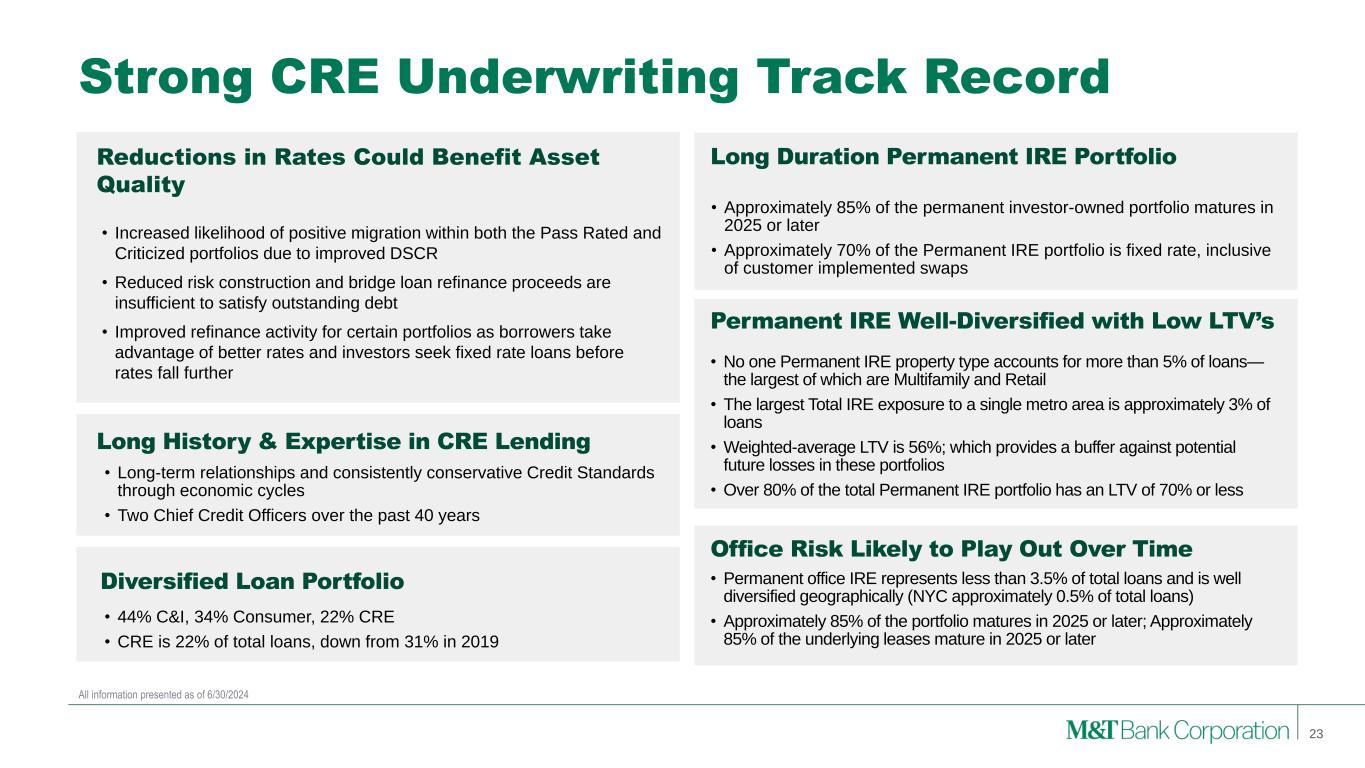Strong CRE Underwriting Track Record All information presented as of 6/30/2024 Long History & Expertise in CRE Lending • Long-term relationships and consistently conservative Credit Standards through economic cycles • Two Chief Credit Officers over the past 40 years Diversified Loan Portfolio • 44% C&I, 34% Consumer, 22% CRE • CRE is 22% of total loans, down from 31% in 2019 • Approximately 85% of the permanent investor-owned portfolio matures in 2025 or later • Approximately 70% of the Permanent IRE portfolio is fixed rate, inclusive of customer implemented swaps Permanent IRE Well-Diversified with Low LTV’s • No one Permanent IRE property type accounts for more than 5% of loans— the largest of which are Multifamily and Retail • The largest Total IRE exposure to a single metro area is approximately 3% of loans • Weighted-average LTV is 56%; which provides a buffer against potential future losses in these portfolios • Over 80% of the total Permanent IRE portfolio has an LTV of 70% or less Office Risk Likely to Play Out Over Time • Permanent office IRE represents less than 3.5% of total loans and is well diversified geographically (NYC approximately 0.5% of total loans) • Approximately 85% of the portfolio matures in 2025 or later; Approximately 85% of the underlying leases mature in 2025 or later 23 Long Duration Permanent IRE PortfolioReductions in Rates Could Benefit Asset Quality • Increased likelihood of positive migration within both the Pass Rated and Criticized portfolios due to improved DSCR • Reduced risk construction and bridge loan refinance proceeds are insufficient to satisfy outstanding debt • Improved refinance activity for certain portfolios as borrowers take advantage of better rates and investors seek fixed rate loans before rates fall further