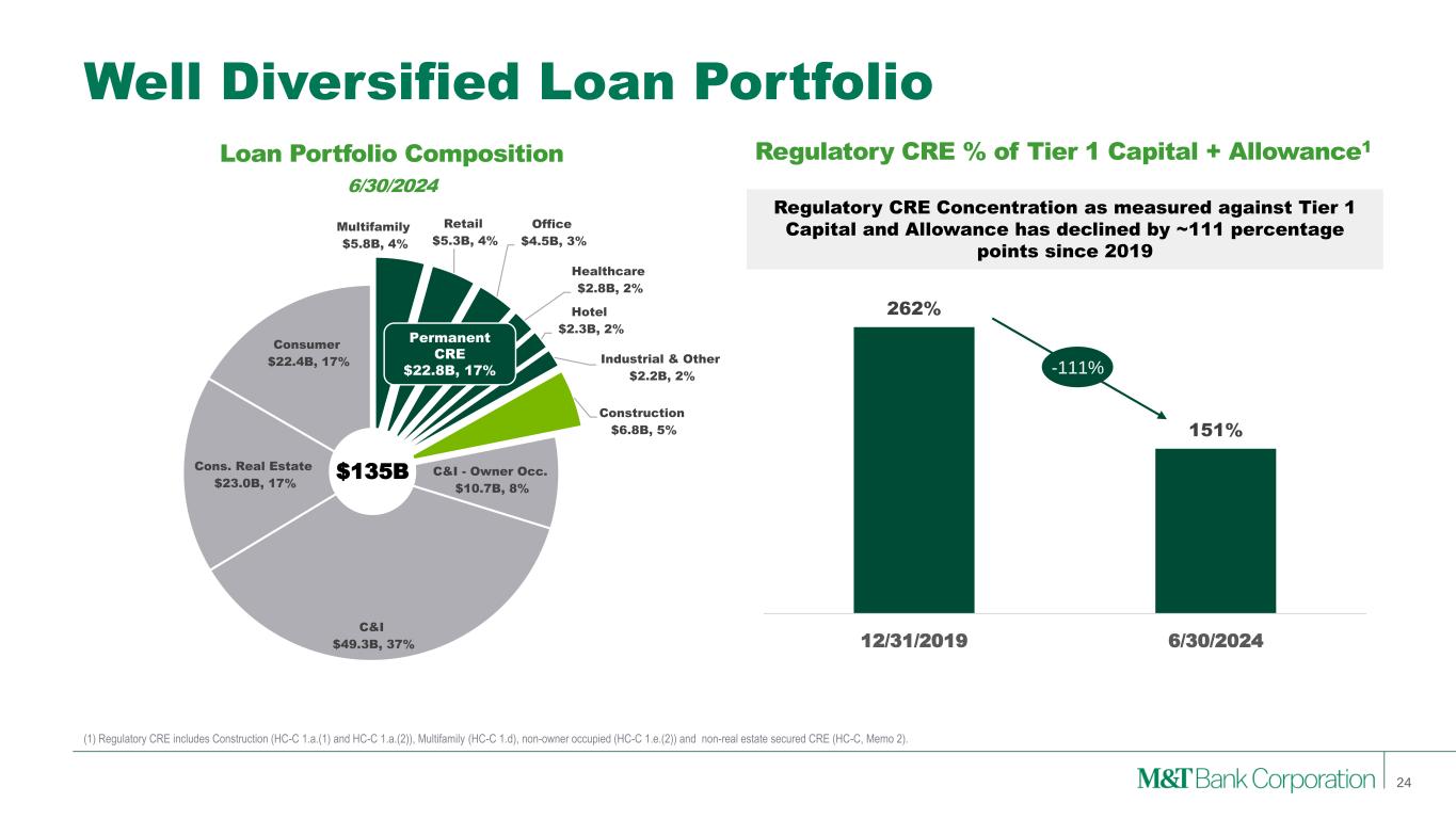 Multifamily $5.8B, 4% Retail $5.3B, 4% Office $4.5B, 3% Healthcare $2.8B, 2% Hotel $2.3B, 2% Industrial & Other $2.2B, 2% Construction $6.8B, 5% C&I - Owner Occ. $10.7B, 8% C&I $49.3B, 37% Cons. Real Estate $23.0B, 17% Consumer $22.4B, 17% Permanent CRE $22.8B, 17% Well Diversified Loan Portfolio (1) Regulatory CRE includes Construction (HC-C 1.a.(1) and HC-C 1.a.(2)), Multifamily (HC-C 1.d), non-owner occupied (HC-C 1.e.(2)) and non-real estate secured CRE (HC-C, Memo 2). Loan Portfolio Composition 6/30/2024 Regulatory CRE % of Tier 1 Capital + Allowance1 Regulatory CRE Concentration as measured against Tier 1 Capital and Allowance has declined by ~111 percentage points since 2019 $135B 24 262% 151% 12/31/2019 6/30/2024 -111%