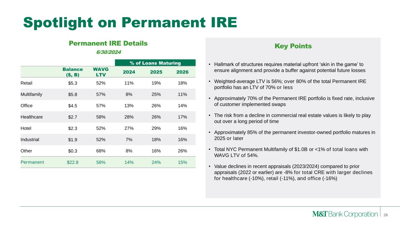Spotlight on Permanent IRE • Hallmark of structures requires material upfront ‘skin in the game’ to ensure alignment and provide a buffer against potential future losses • Weighted-average LTV is 56%; over 80% of the total Permanent IRE portfolio has an LTV of 70% or less • Approximately 70% of the Permanent IRE portfolio is fixed rate, inclusive of customer implemented swaps • The risk from a decline in commercial real estate values is likely to play out over a long period of time • Approximately 85% of the permanent investor-owned portfolio matures in 2025 or later • Total NYC Permanent Multifamily of $1.0B or <1% of total loans with WAVG LTV of 54%. • Value declines in recent appraisals (2023/2024) compared to prior appraisals (2022 or earlier) are -8% for total CRE with larger declines for healthcare (-10%), retail (-11%), and office (-16%) % of Loans Maturing Balance ($, B) WAVG LTV 2024 2025 2026 Retail $5.3 52% 11% 19% 18% Multifamily $5.8 57% 8% 25% 11% Office $4.5 57% 13% 26% 14% Healthcare $2.7 58% 28% 26% 17% Hotel $2.3 52% 27% 29% 16% Industrial $1.9 52% 7% 18% 16% Other $0.3 68% 8% 16% 26% Permanent $22.8 56% 14% 24% 15% Permanent IRE Details 6/30/2024 Key Points 26