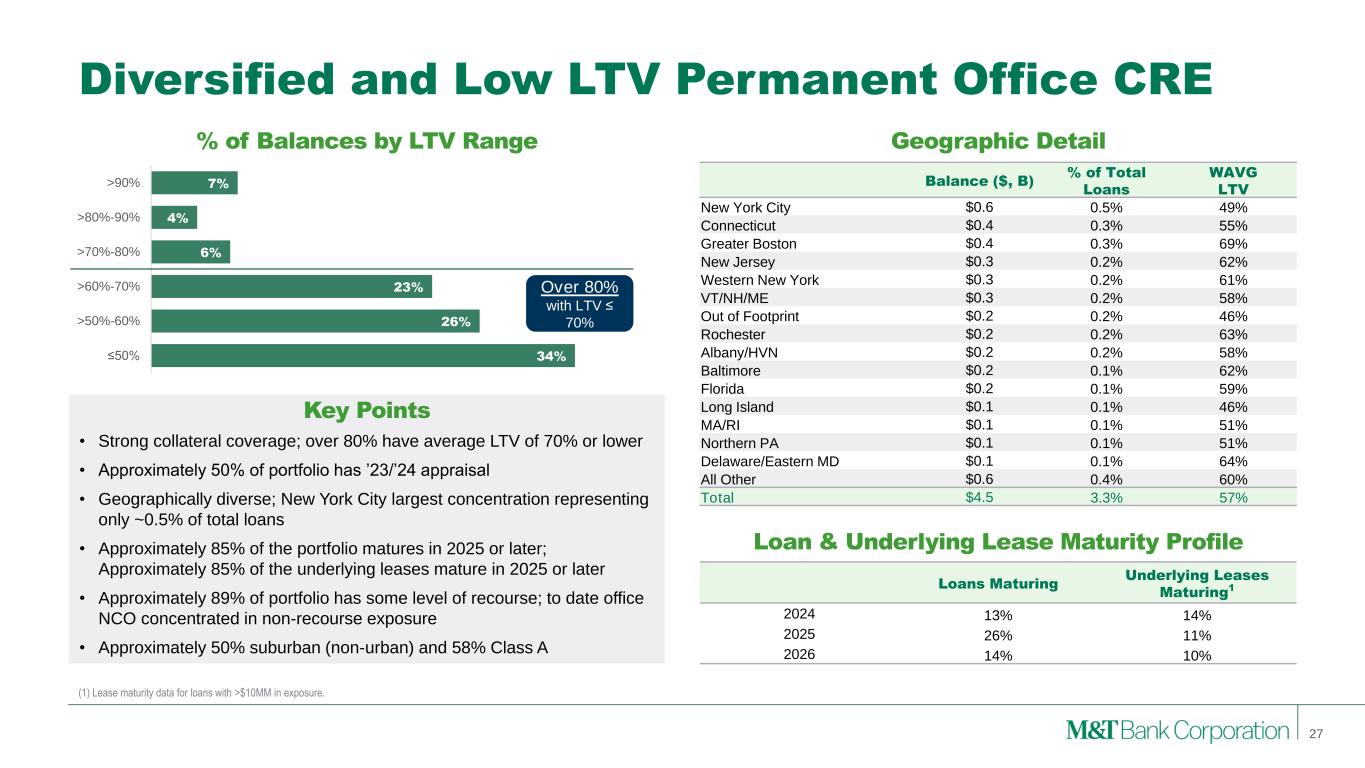 34% 26% 23% 6% 4% 7% ≤50% >50%-60% >60%-70% >70%-80% >80%-90% >90% Diversified and Low LTV Permanent Office CRE (1) Lease maturity data for loans with >$10MM in exposure. Balance ($, B) % of Total Loans WAVG LTV New York City $0.6 0.5% 49% Connecticut $0.4 0.3% 55% Greater Boston $0.4 0.3% 69% New Jersey $0.3 0.2% 62% Western New York $0.3 0.2% 61% VT/NH/ME $0.3 0.2% 58% Out of Footprint $0.2 0.2% 46% Rochester $0.2 0.2% 63% Albany/HVN $0.2 0.2% 58% Baltimore $0.2 0.1% 62% Florida $0.2 0.1% 59% Long Island $0.1 0.1% 46% MA/RI $0.1 0.1% 51% Northern PA $0.1 0.1% 51% Delaware/Eastern MD $0.1 0.1% 64% All Other $0.6 0.4% 60% Total $4.5 3.3% 57% Loans Maturing Underlying Leases Maturing1 2024 13% 14% 2025 26% 11% 2026 14% 10% • Strong collateral coverage; over 80% have average LTV of 70% or lower • Approximately 50% of portfolio has ’23/’24 appraisal • Geographically diverse; New York City largest concentration representing only ~0.5% of total loans • Approximately 85% of the portfolio matures in 2025 or later; Approximately 85% of the underlying leases mature in 2025 or later • Approximately 89% of portfolio has some level of recourse; to date office NCO concentrated in non-recourse exposure • Approximately 50% suburban (non-urban) and 58% Class A % of Balances by LTV Range Key Points Loan & Underlying Lease Maturity Profile Geographic Detail Over 80% with LTV ≤ 70% 27