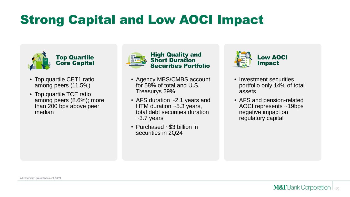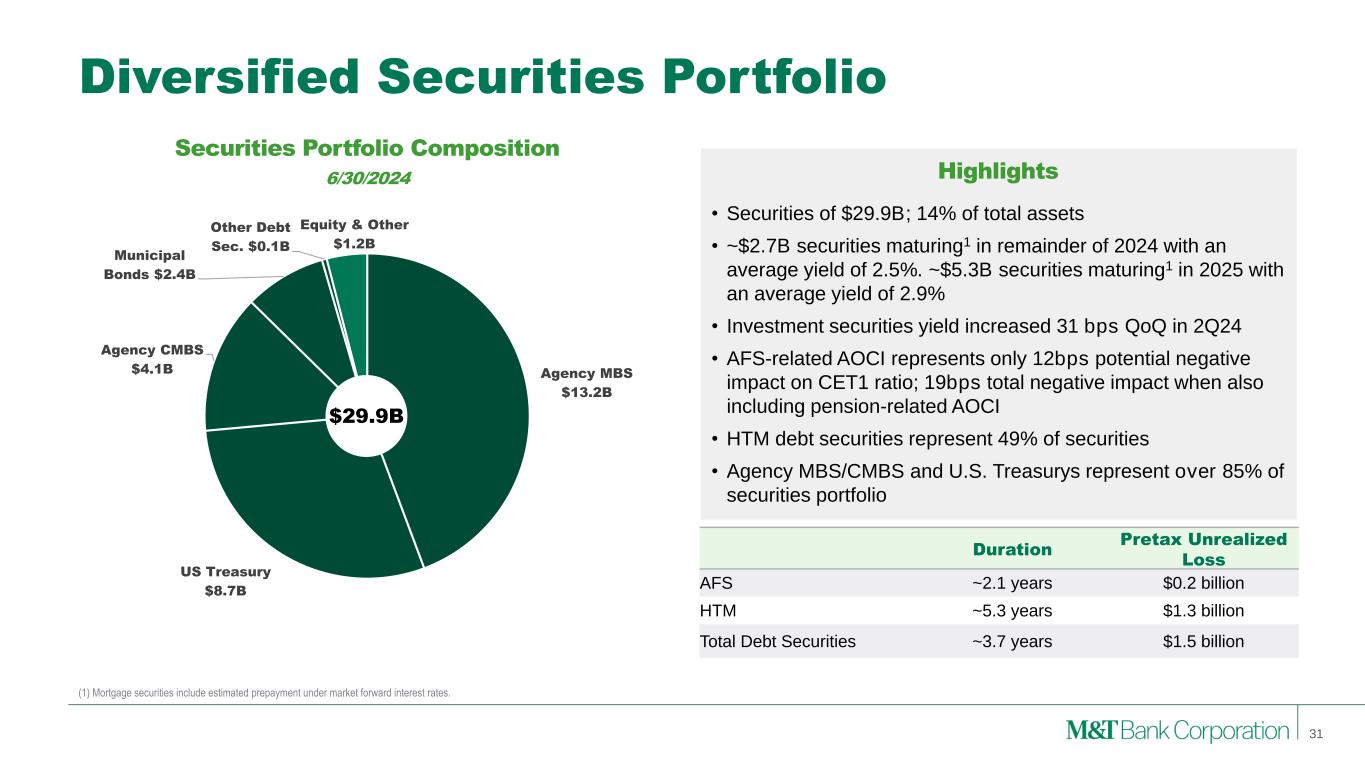 Agency MBS $13.2B US Treasury $8.7B Agency CMBS $4.1B Municipal Bonds $2.4B Other Debt Sec. $0.1B Equity & Other $1.2B Diversified Securities Portfolio (1) Mortgage securities include estimated prepayment under market forward interest rates. $29.9B Securities Portfolio Composition 6/30/2024 • Securities of $29.9B; 14% of total assets • ~$2.7B securities maturing1 in remainder of 2024 with an average yield of 2.5%. ~$5.3B securities maturing1 in 2025 with an average yield of 2.9% • Investment securities yield increased 31 bps QoQ in 2Q24 • AFS-related AOCI represents only 12bps potential negative impact on CET1 ratio; 19bps total negative impact when also including pension-related AOCI • HTM debt securities represent 49% of securities • Agency MBS/CMBS and U.S. Treasurys represent over 85% of securities portfolio Duration Pretax Unrealized Loss AFS ~2.1 years $0.2 billion HTM ~5.3 years $1.3 billion Total Debt Securities ~3.7 years $1.5 billion Highlights 31