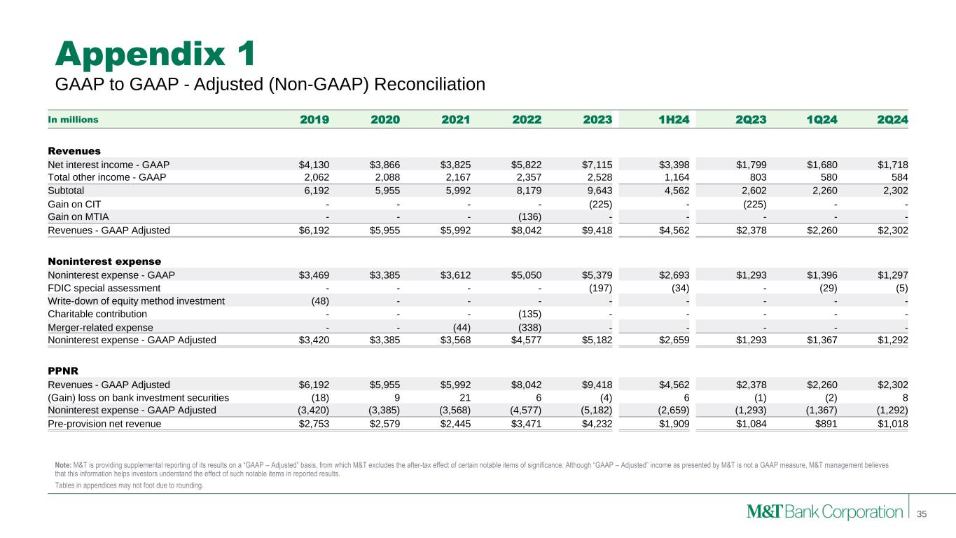 Appendix 1 Note: M&T is providing supplemental reporting of its results on a “GAAP – Adjusted” basis, from which M&T excludes the after-tax effect of certain notable items of significance. Although “GAAP – Adjusted” income as presented by M&T is not a GAAP measure, M&T management believes that this information helps investors understand the effect of such notable items in reported results. Tables in appendices may not foot due to rounding. GAAP to GAAP - Adjusted (Non-GAAP) Reconciliation 35 In millions 2019 2020 2021 2022 2023 1H24 2Q23 1Q24 2Q24 Revenues Net interest income - GAAP $4,130 $3,866 $3,825 $5,822 $7,115 $3,398 $1,799 $1,680 $1,718 Total other income - GAAP 2,062 2,088 2,167 2,357 2,528 1,164 803 580 584 Subtotal 6,192 5,955 5,992 8,179 9,643 4,562 2,602 2,260 2,302 Gain on CIT - - - - (225) - (225) - - Gain on MTIA - - - (136) - - - - - Revenues - GAAP Adjusted $6,192 $5,955 $5,992 $8,042 $9,418 $4,562 $2,378 $2,260 $2,302 Noninterest expense Noninterest expense - GAAP $3,469 $3,385 $3,612 $5,050 $5,379 $2,693 $1,293 $1,396 $1,297 FDIC special assessment - - - - (197) (34) - (29) (5) Write-down of equity method investment (48) - - - - - - - - Charitable contribution - - - (135) - - - - - Merger-related expense - - (44) (338) - - - - - Noninterest expense - GAAP Adjusted $3,420 $3,385 $3,568 $4,577 $5,182 $2,659 $1,293 $1,367 $1,292 PPNR Revenues - GAAP Adjusted $6,192 $5,955 $5,992 $8,042 $9,418 $4,562 $2,378 $2,260 $2,302 (Gain) loss on bank investment securities (18) 9 21 6 (4) 6 (1) (2) 8 Noninterest expense - GAAP Adjusted (3,420) (3,385) (3,568) (4,577) (5,182) (2,659) (1,293) (1,367) (1,292) Pre-provision net revenue $2,753 $2,579 $2,445 $3,471 $4,232 $1,909 $1,084 $891 $1,018