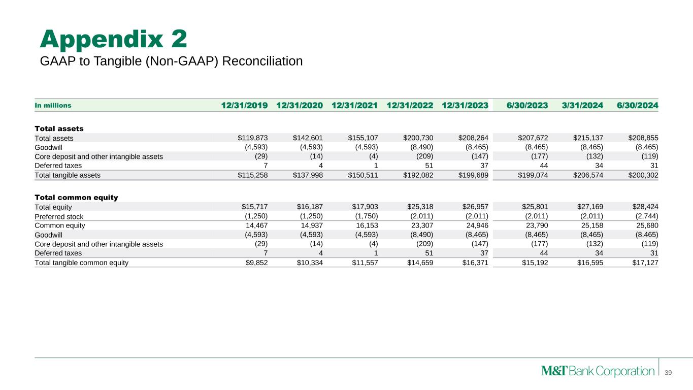 Appendix 2 GAAP to Tangible (Non-GAAP) Reconciliation 38 In millions 2019 2020 2021 2022 2023 1H24 2Q23 1Q24 2Q24 Average assets Average assets $119,584 $135,480 $152,669 $190,252 $205,397 $211,729 $204,376 $211,478 $211,981 Goodwill (4,593) (4,593) (4,593) (7,537) (8,473) (8,465) (8,473) (8,465) (8,465) Core deposit and other intangible assets (38) (21) (8) (179) (177) (133) (185) (140) (126) Deferred taxes 10 5 2 43 44 32 46 33 30 Average tangible assets $114,963 $130,871 $148,070 $182,579 $196,791 $203,163 $195,764 $202,906 $203,420 Average common equity Average total equity $15,718 $15,991 $16,909 $23,810 $25,899 $27,382 $25,685 $27,019 $27,745 Preferred stock (1,272) (1,250) (1,438) (1,946) (2,011) (2,208) (2,011) (2,011) (2,405) Average common equity 14,446 14,741 15,471 21,864 23,888 25,174 23,674 25,008 25,340 Goodwill (4,593) (4,593) (4,593) (7,537) (8,473) (8,465) (8,473) (8,465) (8,465) Core deposit and other intangible assets (38) (21) (8) (179) (177) (133) (185) (140) (126) Deferred taxes 10 5 2 43 44 32 46 33 30 Average tangible common equity $9,825 $10,132 $10,872 $14,191 $15,282 $16,608 $15,062 $16,436 $16,779