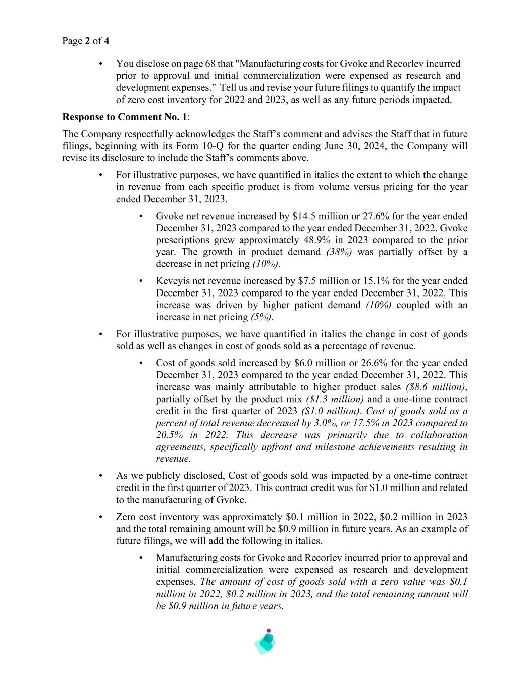 Page 2 of 4 • You disclose on page 68 that "Manufacturing costs for Gvoke and Recorlev incurred prior to approval and initial commercialization were expensed as research and development expenses." Tell us and revise your future filings to quantify the impact of zero cost inventory for 2022 and 2023, as well as any future periods impacted. Response to Comment No. 1: The Company respectfully acknowledges the Staff’s comment and advises the Staff that in future filings, beginning with its Form 10-Q for the quarter ending June 30, 2024, the Company will revise its disclosure to include the Staff’s comments above. • For illustrative purposes, we have quantified in italics the extent to which the change in revenue from each specific product is from volume versus pricing for the year ended December 31, 2023. • Gvoke net revenue increased by $14.5 million or 27.6% for the year ended December 31, 2023 compared to the year ended December 31, 2022. Gvoke prescriptions grew approximately 48.9% in 2023 compared to the prior year. The growth in product demand (38%) was partially offset by a decrease in net pricing (10%). • Keveyis net revenue increased by $7.5 million or 15.1% for the year ended December 31, 2023 compared to the year ended December 31, 2022. This increase was driven by higher patient demand (10%) coupled with an increase in net pricing (5%). • For illustrative purposes, we have quantified in italics the change in cost of goods sold as well as changes in cost of goods sold as a percentage of revenue. • Cost of goods sold increased by $6.0 million or 26.6% for the year ended December 31, 2023 compared to the year ended December 31, 2022. This increase was mainly attributable to higher product sales ($8.6 million), partially offset by the product mix ($1.3 million) and a one-time contract credit in the first quarter of 2023 ($1.0 million). Cost of goods sold as a percent of total revenue decreased by 3.0%, or 17.5% in 2023 compared to 20.5% in 2022. This decrease was primarily due to collaboration agreements, specifically upfront and milestone achievements resulting in revenue. • As we publicly disclosed, Cost of goods sold was impacted by a one-time contract credit in the first quarter of 2023. This contract credit was for $1.0 million and related to the manufacturing of Gvoke. • Zero cost inventory was approximately $0.1 million in 2022, $0.2 million in 2023 and the total remaining amount will be $0.9 million in future years. As an example of future filings, we will add the following in italics. • Manufacturing costs for Gvoke and Recorlev incurred prior to approval and initial commercialization were expensed as research and development expenses. The amount of cost of goods sold with a zero value was $0.1 million in 2022, $0.2 million in 2023, and the total remaining amount will be $0.9 million in future years.