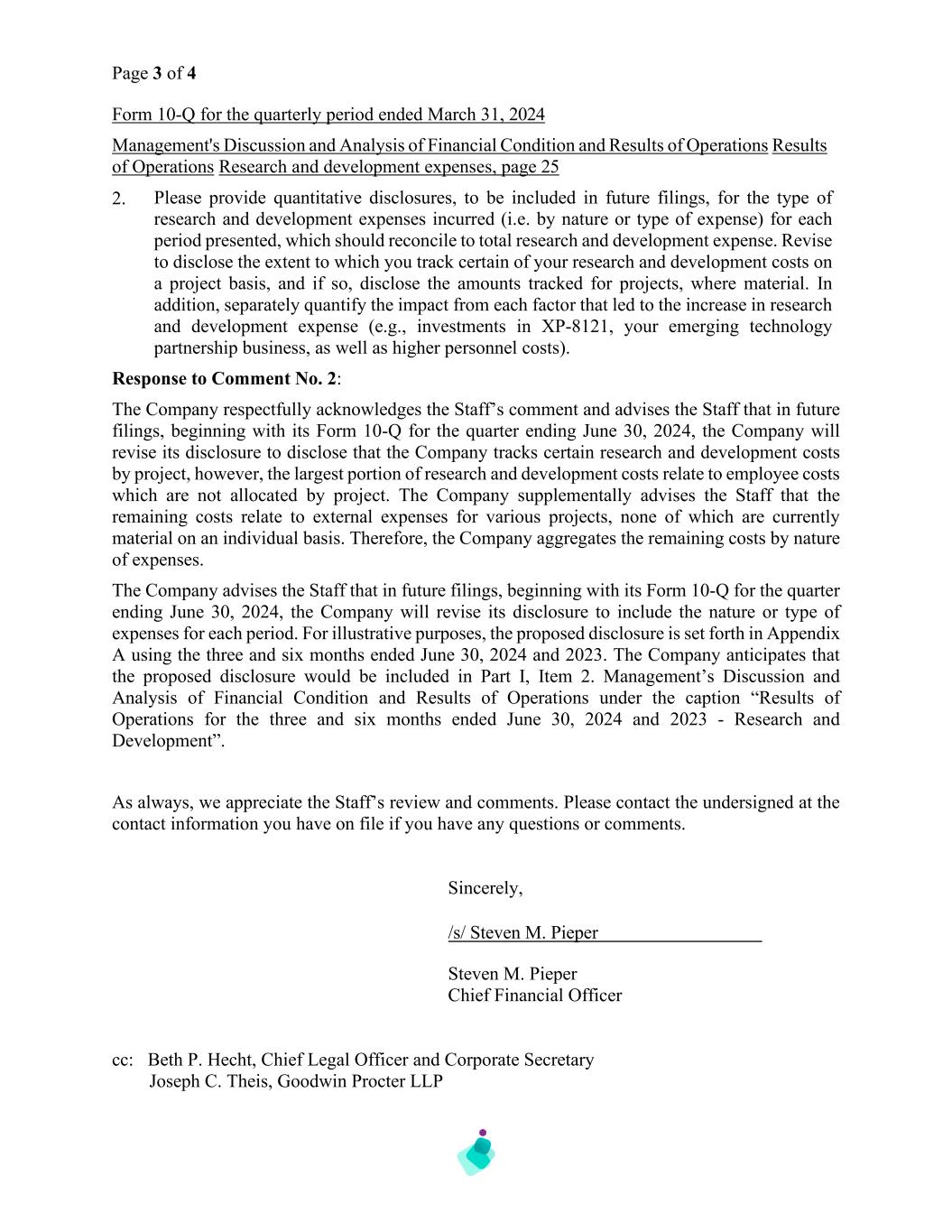 Page 3 of 4 Form 10-Q for the quarterly period ended March 31, 2024 Management's Discussion and Analysis of Financial Condition and Results of Operations Results of Operations Research and development expenses, page 25 2. Please provide quantitative disclosures, to be included in future filings, for the type of research and development expenses incurred (i.e. by nature or type of expense) for each period presented, which should reconcile to total research and development expense. Revise to disclose the extent to which you track certain of your research and development costs on a project basis, and if so, disclose the amounts tracked for projects, where material. In addition, separately quantify the impact from each factor that led to the increase in research and development expense (e.g., investments in XP-8121, your emerging technology partnership business, as well as higher personnel costs). Response to Comment No. 2: The Company respectfully acknowledges the Staff’s comment and advises the Staff that in future filings, beginning with its Form 10-Q for the quarter ending June 30, 2024, the Company will revise its disclosure to disclose that the Company tracks certain research and development costs by project, however, the largest portion of research and development costs relate to employee costs which are not allocated by project. The Company supplementally advises the Staff that the remaining costs relate to external expenses for various projects, none of which are currently material on an individual basis. Therefore, the Company aggregates the remaining costs by nature of expenses. The Company advises the Staff that in future filings, beginning with its Form 10-Q for the quarter ending June 30, 2024, the Company will revise its disclosure to include the nature or type of expenses for each period. For illustrative purposes, the proposed disclosure is set forth in Appendix A using the three and six months ended June 30, 2024 and 2023. The Company anticipates that the proposed disclosure would be included in Part I, Item 2. Management’s Discussion and Analysis of Financial Condition and Results of Operations under the caption “Results of Operations for the three and six months ended June 30, 2024 and 2023 - Research and Development”. As always, we appreciate the Staff’s review and comments. Please contact the undersigned at the contact information you have on file if you have any questions or comments. Sincerely, Steven M. Pieper Chief Financial Officer cc: Beth P. Hecht, Chief Legal Officer and Corporate Secretary Joseph C. Theis, Goodwin Procter LLP /s/ Steven M. Pieper