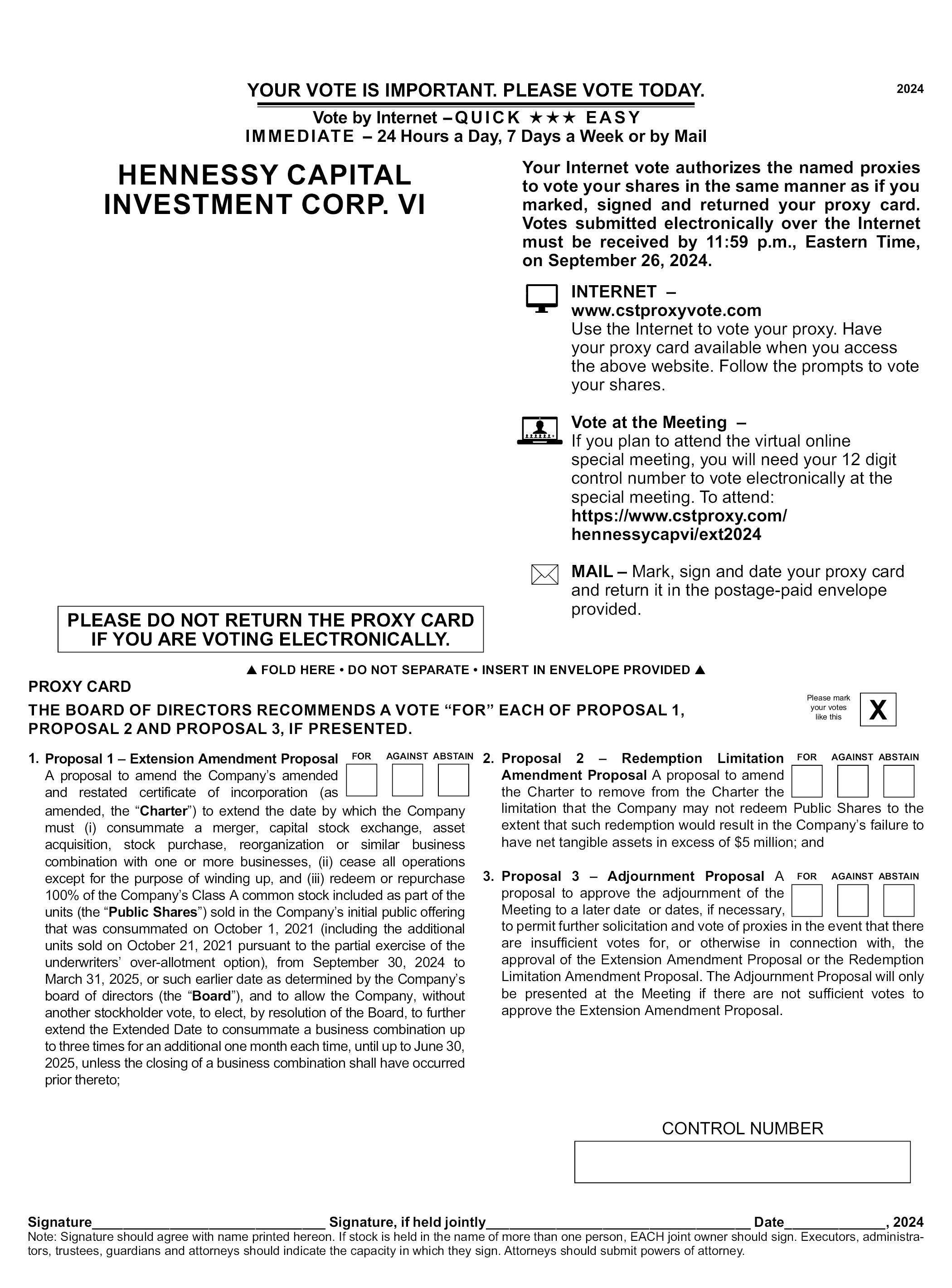 2024 YOUR VOTE IS IMPORTANT. PLEASE VOTE TODAY. Vote by Internet - QUICK EASY IMMEDIATE - 24 Hours a Day, 7 Days a Week or by Mail HENNESSY CAPITAL INVESTMENT CORP. VI Your Internet vote authorizes the named proxies to vote your shares in the same manner as if you marked, signed and returned your proxy card. Votes submitted electronically over the Internet must be received by 11:59 p.m., Eastern Time, on September 26, 2024. INTERNET – www.cstproxyvote.com Use the Internet to vote your proxy. Have your proxy card available when you access the above website. Follow the prompts to vote your shares. Vote at the Meeting – If you plan to attend the virtual online special meeting, you will need your 12 digit control number to vote electronically at the special meeting. To attend: https://www.cstproxy.com/ hennessycapvi/ext2024 MAIL – Mark, sign and date your proxy card and return it in the postage-paid envelope provided. PLEASE DO NOT RETURN THE PROXY CARD IF YOU ARE VOTING ELECTRONICALLY. FOLD HERE DO NOT SEPARATE INSERT IN ENVELOPE PROVIDED PROXY CARD THE BOARD OF DIRECTORS RECOMMENDS A VOTE “FOR” EACH OF PROPOSAL 1, PROPOSAL 2 AND PROPOSAL 3, IF PRESENTED. Please mark your votes like this X 1. FOR AGAINST ABSTAIN Proposal 1 – Extension Amendment Proposal A proposal to amend the Company’s amended and restated certificate of incorporation (as amended, the “Charter”) to extend the date by which the Company must (i) consummate a merger, capital stock exchange, asset acquisition, stock purchase, reorganization or similar business combination with one or more businesses, (ii) cease all operations except for the purpose of winding up, and (iii) redeem or repurchase 100% of the Company’s Class A common stock included as part of the units (the “Public Shares”) sold in the Company’s initial public offering that was consummated on October 1, 2021 (including the additional units sold on October 21, 2021 pursuant to the partial exercise of the underwriters’ over-allotment option), from September 30, 2024 to March 31, 2025, or such earlier date as determined by the Company’s board of directors (the “Board”), and to allow the Company, without another stockholder vote, to elect, by resolution of the Board, to further extend the Extended Date to consummate a business combination up to three times for an additional one month each time, until up to June 30, 2025, unless the closing of a business combination shall have occurred prior thereto; FOR AGAINST ABSTAIN 2. Proposal 2 – Redemption Limitation Amendment Proposal A proposal to amend the Charter to remove from the Charter the limitation that the Company may not redeem Public Shares to the extent that such redemption would result in the Company’s failure to have net tangible assets in excess of $5 million; and FOR AGAINST ABSTAIN 3. Proposal 3 – Adjournment Proposal A proposal to approve the adjournment of the Meeting to a later date or dates, if necessary, to permit further solicitation and vote of proxies in the event that there are insufficient votes for, or otherwise in connection with, the approval of the Extension Amendment Proposal or the Redemption Limitation Amendment Proposal. The Adjournment Proposal will only be presented at the Meeting if there are not sufficient votes to approve the Extension Amendment Proposal. CONTROL NUMBER Signature Signature, if held jointly Date, 2024 Note: Signature should agree with name printed hereon. If stock is held in the name of more than one person, EACH joint owner should sign. Executors, administrators, trustees, guardians and attorneys should indicate the capacity in which they sign. Attorneys should submit powers of attorney.