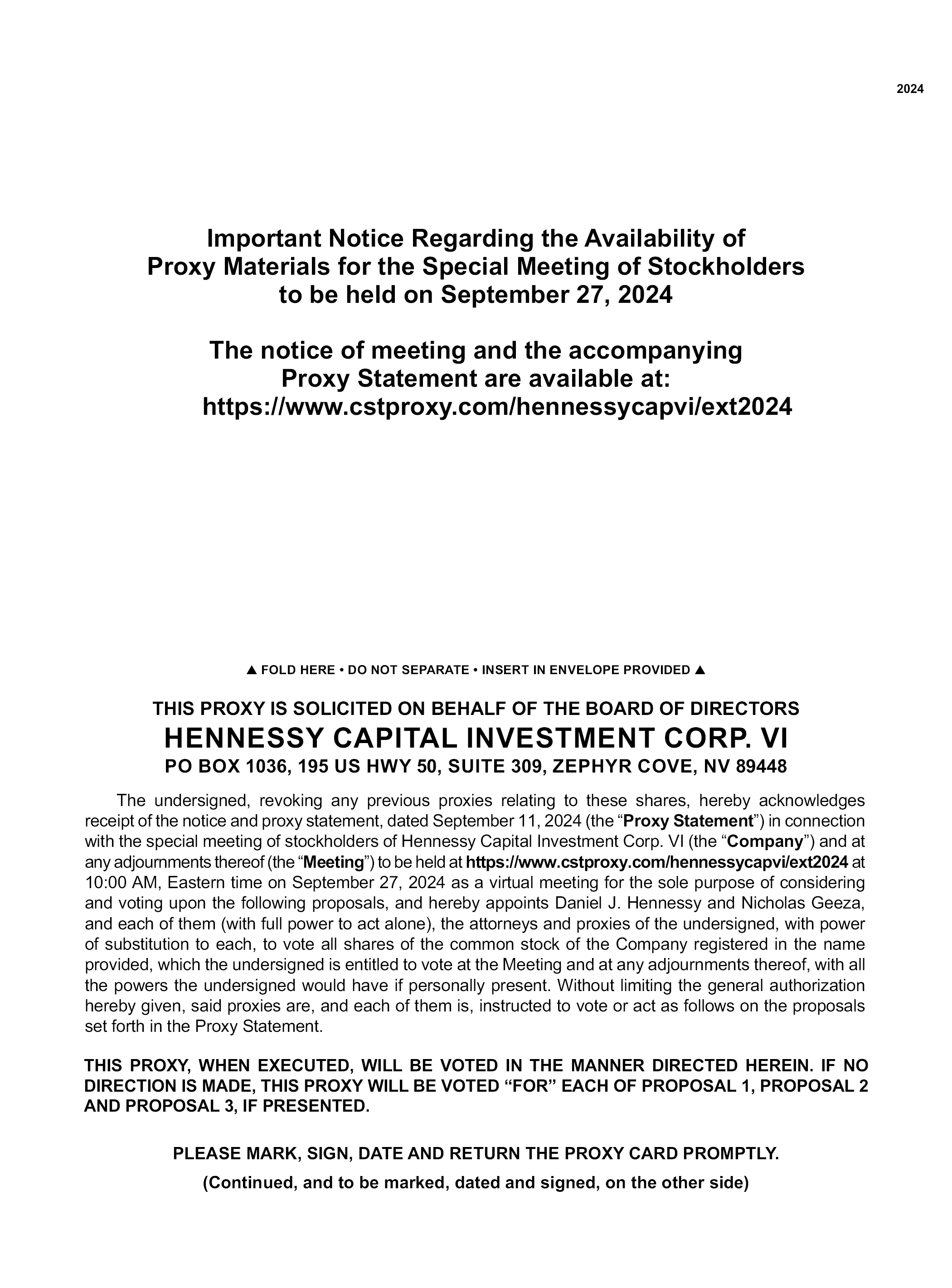 2024 Important Notice Regarding the Availability of Proxy Materials for the Special Meeting of Stockholders to be held on September 27, 2024 The notice of meeting and the accompanying Proxy Statement are available at: https://www.cstproxy.com/hennessycapvi/ext2024 FOLD HERE • DO NOT SEPARATE • INSERT IN ENVELOPE PROVIDED THIS PROXY IS SOLICITED ON BEHALF OF THE BOARD OF DIRECTORS HENNESSY CAPITAL INVESTMENT CORP. VI PO BOX 1036, 195 US HWY 50, SUITE 309, ZEPHYR COVE, NV 89448 THIS PROXY, WHEN EXECUTED, WILL BE VOTED IN THE MANNER DIRECTED HEREIN. IF NO DIRECTION IS MADE, THIS PROXY WILL BE VOTED “FOR” EACH OF PROPOSAL 1, PROPOSAL 2 AND PROPOSAL 3, IF PRESENTED. PLEASE MARK, SIGN, DATE AND RETURN THE PROXY CARD PROMPTLY. (Continued, and to be marked, dated and signed, on the other side) The undersigned, revoking any previous proxies relating to these shares, hereby acknowledges receipt of the notice and proxy statement, dated September 11, 2024 (the “Proxy Statement”) in connection with the special meeting of stockholders of Hennessy Capital Investment Corp. VI (the “Company”) and at any adjournments thereof (the “Meeting”) to be held at https://www.cstproxy.com/hennessycapvi/ext2024 at 10:00 AM, Eastern time on September 27, 2024 as a virtual meeting for the sole purpose of considering and voting upon the following proposals, and hereby appoints Daniel J. Hennessy and Nicholas Geeza, and each of them (with full power to act alone), the attorneys and proxies of the undersigned, with power of substitution to each, to vote all shares of the common stock of the Company registered in the name provided, which the undersigned is entitled to vote at the Meeting and at any adjournments thereof, with all the powers the undersigned would have if personally present. Without limiting the general authorization hereby given, said proxies are, and each of them is, instructed to vote or act as follows on the proposals set forth in the Proxy Statement.