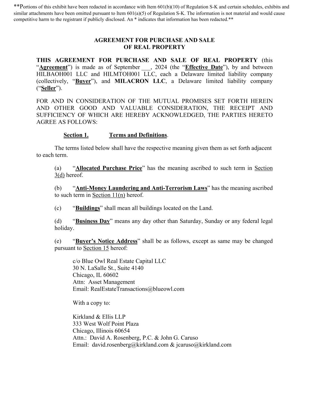 AGREEMENT FOR PURCHASE AND SALE OF REAL PROPERTY THIS AGREEMENT FOR PURCHASE AND SALE OF REAL PROPERTY (this “Agreement”) is made as of September ___, 2024 (the “Effective Date”), by and between HILBAOH001 LLC and HILMTOH001 LLC, each a Delaware limited liability company (collectively, “Buyer”), and MILACRON LLC, a Delaware limited liability company (“Seller”). FOR AND IN CONSIDERATION OF THE MUTUAL PROMISES SET FORTH HEREIN AND OTHER GOOD AND VALUABLE CONSIDERATION, THE RECEIPT AND SUFFICIENCY OF WHICH ARE HEREBY ACKNOWLEDGED, THE PARTIES HERETO AGREE AS FOLLOWS: Section 1. Terms and Definitions. The terms listed below shall have the respective meaning given them as set forth adjacent to each term. (a) “Allocated Purchase Price” has the meaning ascribed to such term in Section 3(d) hereof. (b) “Anti-Money Laundering and Anti-Terrorism Laws” has the meaning ascribed to such term in Section 11(n) hereof. (c) “Buildings” shall mean all buildings located on the Land. (d) “Business Day” means any day other than Saturday, Sunday or any federal legal holiday. (e) “Buyer’s Notice Address” shall be as follows, except as same may be changed pursuant to Section 15 hereof: c/o Blue Owl Real Estate Capital LLC 30 N. LaSalle St., Suite 4140 Chicago, IL 60602 Attn: Asset Management Email: RealEstateTransactions@blueowl.com With a copy to: Kirkland & Ellis LLP 333 West Wolf Point Plaza Chicago, Illinois 60654 Attn.: David A. Rosenberg, P.C. & John G. Caruso Email: david.rosenberg@kirkland.com & jcaruso@kirkland.com **Portions of this exhibit have been redacted in accordance with Item 601(b)(10) of Regulation S-K and certain schedules, exhibits and similar attachments have been omitted pursuant to Item 601(a)(5) of Regulation S-K. The information is not material and would cause competitive harm to the registrant if publicly disclosed. An * indicates that information has been redacted.**