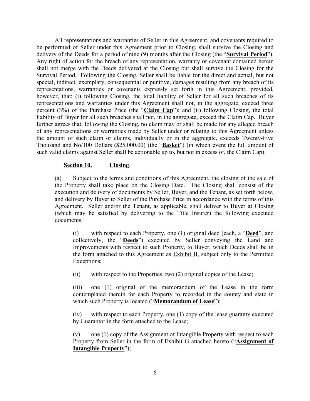 6 All representations and warranties of Seller in this Agreement, and covenants required to be performed of Seller under this Agreement prior to Closing, shall survive the Closing and delivery of the Deeds for a period of nine (9) months after the Closing (the “Survival Period”). Any right of action for the breach of any representation, warranty or covenant contained herein shall not merge with the Deeds delivered at the Closing but shall survive the Closing for the Survival Period. Following the Closing, Seller shall be liable for the direct and actual, but not special, indirect, exemplary, consequential or punitive, damages resulting from any breach of its representations, warranties or covenants expressly set forth in this Agreement; provided, however, that: (i) following Closing, the total liability of Seller for all such breaches of its representations and warranties under this Agreement shall not, in the aggregate, exceed three percent (3%) of the Purchase Price (the “Claim Cap”); and (ii) following Closing, the total liability of Buyer for all such breaches shall not, in the aggregate, exceed the Claim Cap. Buyer further agrees that, following the Closing, no claim may or shall be made for any alleged breach of any representations or warranties made by Seller under or relating to this Agreement unless the amount of such claim or claims, individually or in the aggregate, exceeds Twenty-Five Thousand and No/100 Dollars ($25,000.00) (the “Basket”) (in which event the full amount of such valid claims against Seller shall be actionable up to, but not in excess of, the Claim Cap). Section 10. Closing. (a) Subject to the terms and conditions of this Agreement, the closing of the sale of the Property shall take place on the Closing Date. The Closing shall consist of the execution and delivery of documents by Seller, Buyer, and the Tenant, as set forth below, and delivery by Buyer to Seller of the Purchase Price in accordance with the terms of this Agreement. Seller and/or the Tenant, as applicable, shall deliver to Buyer at Closing (which may be satisfied by delivering to the Title Insurer) the following executed documents: (i) with respect to each Property, one (1) original deed (each, a “Deed”, and collectively, the “Deeds”) executed by Seller conveying the Land and Improvements with respect to such Property, to Buyer, which Deeds shall be in the form attached to this Agreement as Exhibit B, subject only to the Permitted Exceptions; (ii) with respect to the Properties, two (2) original copies of the Lease; (iii) one (1) original of the memorandum of the Lease in the form contemplated therein for each Property to recorded in the county and state in which such Property is located (“Memorandum of Lease”); (iv) with respect to each Property, one (1) copy of the lease guaranty executed by Guarantor in the form attached to the Lease; (v) one (1) copy of the Assignment of Intangible Property with respect to each Property from Seller in the form of Exhibit G attached hereto (“Assignment of Intangible Property”);
