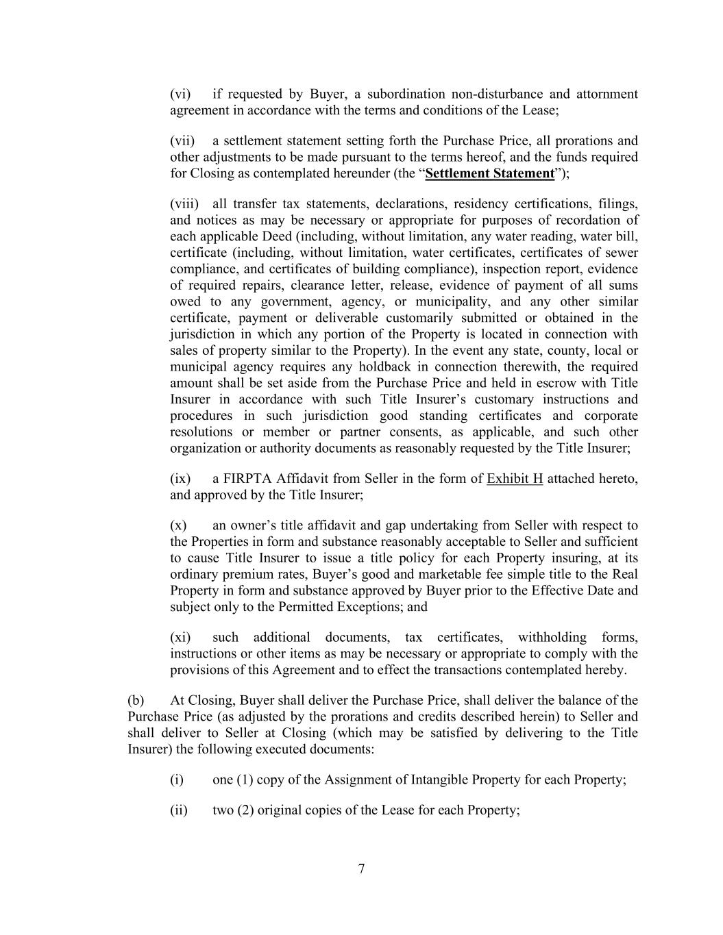 7 (vi) if requested by Buyer, a subordination non-disturbance and attornment agreement in accordance with the terms and conditions of the Lease; (vii) a settlement statement setting forth the Purchase Price, all prorations and other adjustments to be made pursuant to the terms hereof, and the funds required for Closing as contemplated hereunder (the “Settlement Statement”); (viii) all transfer tax statements, declarations, residency certifications, filings, and notices as may be necessary or appropriate for purposes of recordation of each applicable Deed (including, without limitation, any water reading, water bill, certificate (including, without limitation, water certificates, certificates of sewer compliance, and certificates of building compliance), inspection report, evidence of required repairs, clearance letter, release, evidence of payment of all sums owed to any government, agency, or municipality, and any other similar certificate, payment or deliverable customarily submitted or obtained in the jurisdiction in which any portion of the Property is located in connection with sales of property similar to the Property). In the event any state, county, local or municipal agency requires any holdback in connection therewith, the required amount shall be set aside from the Purchase Price and held in escrow with Title Insurer in accordance with such Title Insurer’s customary instructions and procedures in such jurisdiction good standing certificates and corporate resolutions or member or partner consents, as applicable, and such other organization or authority documents as reasonably requested by the Title Insurer; (ix) a FIRPTA Affidavit from Seller in the form of Exhibit H attached hereto, and approved by the Title Insurer; (x) an owner’s title affidavit and gap undertaking from Seller with respect to the Properties in form and substance reasonably acceptable to Seller and sufficient to cause Title Insurer to issue a title policy for each Property insuring, at its ordinary premium rates, Buyer’s good and marketable fee simple title to the Real Property in form and substance approved by Buyer prior to the Effective Date and subject only to the Permitted Exceptions; and (xi) such additional documents, tax certificates, withholding forms, instructions or other items as may be necessary or appropriate to comply with the provisions of this Agreement and to effect the transactions contemplated hereby. (b) At Closing, Buyer shall deliver the Purchase Price, shall deliver the balance of the Purchase Price (as adjusted by the prorations and credits described herein) to Seller and shall deliver to Seller at Closing (which may be satisfied by delivering to the Title Insurer) the following executed documents: (i) one (1) copy of the Assignment of Intangible Property for each Property; (ii) two (2) original copies of the Lease for each Property;