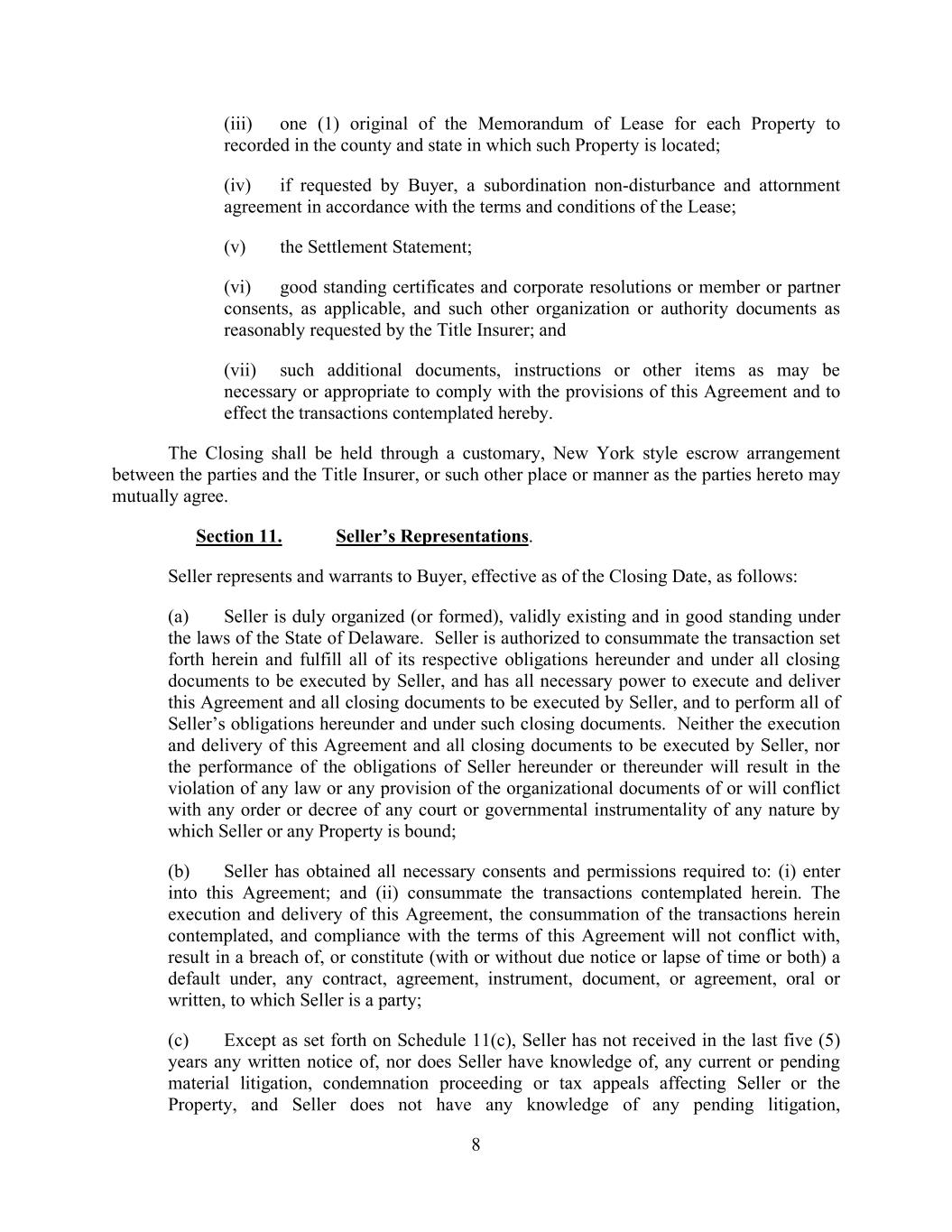 8 (iii) one (1) original of the Memorandum of Lease for each Property to recorded in the county and state in which such Property is located; (iv) if requested by Buyer, a subordination non-disturbance and attornment agreement in accordance with the terms and conditions of the Lease; (v) the Settlement Statement; (vi) good standing certificates and corporate resolutions or member or partner consents, as applicable, and such other organization or authority documents as reasonably requested by the Title Insurer; and (vii) such additional documents, instructions or other items as may be necessary or appropriate to comply with the provisions of this Agreement and to effect the transactions contemplated hereby. The Closing shall be held through a customary, New York style escrow arrangement between the parties and the Title Insurer, or such other place or manner as the parties hereto may mutually agree. Section 11. Seller’s Representations. Seller represents and warrants to Buyer, effective as of the Closing Date, as follows: (a) Seller is duly organized (or formed), validly existing and in good standing under the laws of the State of Delaware. Seller is authorized to consummate the transaction set forth herein and fulfill all of its respective obligations hereunder and under all closing documents to be executed by Seller, and has all necessary power to execute and deliver this Agreement and all closing documents to be executed by Seller, and to perform all of Seller’s obligations hereunder and under such closing documents. Neither the execution and delivery of this Agreement and all closing documents to be executed by Seller, nor the performance of the obligations of Seller hereunder or thereunder will result in the violation of any law or any provision of the organizational documents of or will conflict with any order or decree of any court or governmental instrumentality of any nature by which Seller or any Property is bound; (b) Seller has obtained all necessary consents and permissions required to: (i) enter into this Agreement; and (ii) consummate the transactions contemplated herein. The execution and delivery of this Agreement, the consummation of the transactions herein contemplated, and compliance with the terms of this Agreement will not conflict with, result in a breach of, or constitute (with or without due notice or lapse of time or both) a default under, any contract, agreement, instrument, document, or agreement, oral or written, to which Seller is a party; (c) Except as set forth on Schedule 11(c), Seller has not received in the last five (5) years any written notice of, nor does Seller have knowledge of, any current or pending material litigation, condemnation proceeding or tax appeals affecting Seller or the Property, and Seller does not have any knowledge of any pending litigation,