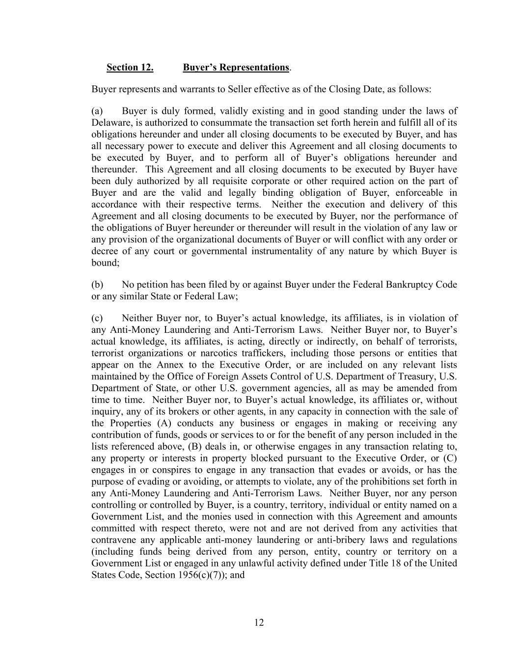 12 Section 12. Buyer’s Representations. Buyer represents and warrants to Seller effective as of the Closing Date, as follows: (a) Buyer is duly formed, validly existing and in good standing under the laws of Delaware, is authorized to consummate the transaction set forth herein and fulfill all of its obligations hereunder and under all closing documents to be executed by Buyer, and has all necessary power to execute and deliver this Agreement and all closing documents to be executed by Buyer, and to perform all of Buyer’s obligations hereunder and thereunder. This Agreement and all closing documents to be executed by Buyer have been duly authorized by all requisite corporate or other required action on the part of Buyer and are the valid and legally binding obligation of Buyer, enforceable in accordance with their respective terms. Neither the execution and delivery of this Agreement and all closing documents to be executed by Buyer, nor the performance of the obligations of Buyer hereunder or thereunder will result in the violation of any law or any provision of the organizational documents of Buyer or will conflict with any order or decree of any court or governmental instrumentality of any nature by which Buyer is bound; (b) No petition has been filed by or against Buyer under the Federal Bankruptcy Code or any similar State or Federal Law; (c) Neither Buyer nor, to Buyer’s actual knowledge, its affiliates, is in violation of any Anti-Money Laundering and Anti-Terrorism Laws. Neither Buyer nor, to Buyer’s actual knowledge, its affiliates, is acting, directly or indirectly, on behalf of terrorists, terrorist organizations or narcotics traffickers, including those persons or entities that appear on the Annex to the Executive Order, or are included on any relevant lists maintained by the Office of Foreign Assets Control of U.S. Department of Treasury, U.S. Department of State, or other U.S. government agencies, all as may be amended from time to time. Neither Buyer nor, to Buyer’s actual knowledge, its affiliates or, without inquiry, any of its brokers or other agents, in any capacity in connection with the sale of the Properties (A) conducts any business or engages in making or receiving any contribution of funds, goods or services to or for the benefit of any person included in the lists referenced above, (B) deals in, or otherwise engages in any transaction relating to, any property or interests in property blocked pursuant to the Executive Order, or (C) engages in or conspires to engage in any transaction that evades or avoids, or has the purpose of evading or avoiding, or attempts to violate, any of the prohibitions set forth in any Anti-Money Laundering and Anti-Terrorism Laws. Neither Buyer, nor any person controlling or controlled by Buyer, is a country, territory, individual or entity named on a Government List, and the monies used in connection with this Agreement and amounts committed with respect thereto, were not and are not derived from any activities that contravene any applicable anti-money laundering or anti-bribery laws and regulations (including funds being derived from any person, entity, country or territory on a Government List or engaged in any unlawful activity defined under Title 18 of the United States Code, Section 1956(c)(7)); and