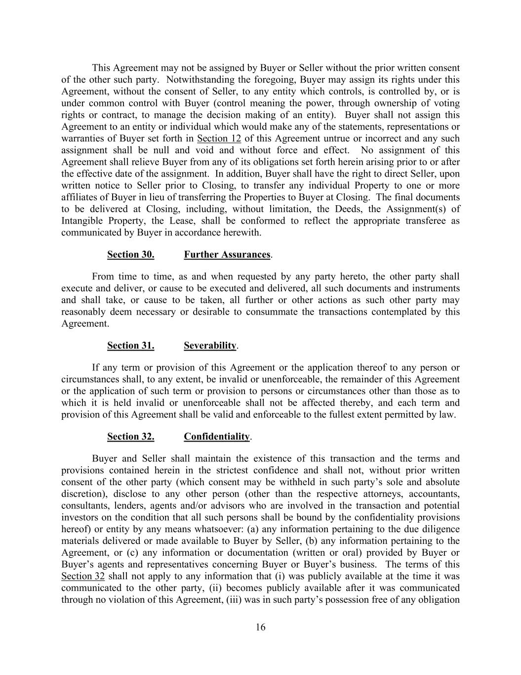 16 This Agreement may not be assigned by Buyer or Seller without the prior written consent of the other such party. Notwithstanding the foregoing, Buyer may assign its rights under this Agreement, without the consent of Seller, to any entity which controls, is controlled by, or is under common control with Buyer (control meaning the power, through ownership of voting rights or contract, to manage the decision making of an entity). Buyer shall not assign this Agreement to an entity or individual which would make any of the statements, representations or warranties of Buyer set forth in Section 12 of this Agreement untrue or incorrect and any such assignment shall be null and void and without force and effect. No assignment of this Agreement shall relieve Buyer from any of its obligations set forth herein arising prior to or after the effective date of the assignment. In addition, Buyer shall have the right to direct Seller, upon written notice to Seller prior to Closing, to transfer any individual Property to one or more affiliates of Buyer in lieu of transferring the Properties to Buyer at Closing. The final documents to be delivered at Closing, including, without limitation, the Deeds, the Assignment(s) of Intangible Property, the Lease, shall be conformed to reflect the appropriate transferee as communicated by Buyer in accordance herewith. Section 30. Further Assurances. From time to time, as and when requested by any party hereto, the other party shall execute and deliver, or cause to be executed and delivered, all such documents and instruments and shall take, or cause to be taken, all further or other actions as such other party may reasonably deem necessary or desirable to consummate the transactions contemplated by this Agreement. Section 31. Severability. If any term or provision of this Agreement or the application thereof to any person or circumstances shall, to any extent, be invalid or unenforceable, the remainder of this Agreement or the application of such term or provision to persons or circumstances other than those as to which it is held invalid or unenforceable shall not be affected thereby, and each term and provision of this Agreement shall be valid and enforceable to the fullest extent permitted by law. Section 32. Confidentiality. Buyer and Seller shall maintain the existence of this transaction and the terms and provisions contained herein in the strictest confidence and shall not, without prior written consent of the other party (which consent may be withheld in such party’s sole and absolute discretion), disclose to any other person (other than the respective attorneys, accountants, consultants, lenders, agents and/or advisors who are involved in the transaction and potential investors on the condition that all such persons shall be bound by the confidentiality provisions hereof) or entity by any means whatsoever: (a) any information pertaining to the due diligence materials delivered or made available to Buyer by Seller, (b) any information pertaining to the Agreement, or (c) any information or documentation (written or oral) provided by Buyer or Buyer’s agents and representatives concerning Buyer or Buyer’s business. The terms of this Section 32 shall not apply to any information that (i) was publicly available at the time it was communicated to the other party, (ii) becomes publicly available after it was communicated through no violation of this Agreement, (iii) was in such party’s possession free of any obligation