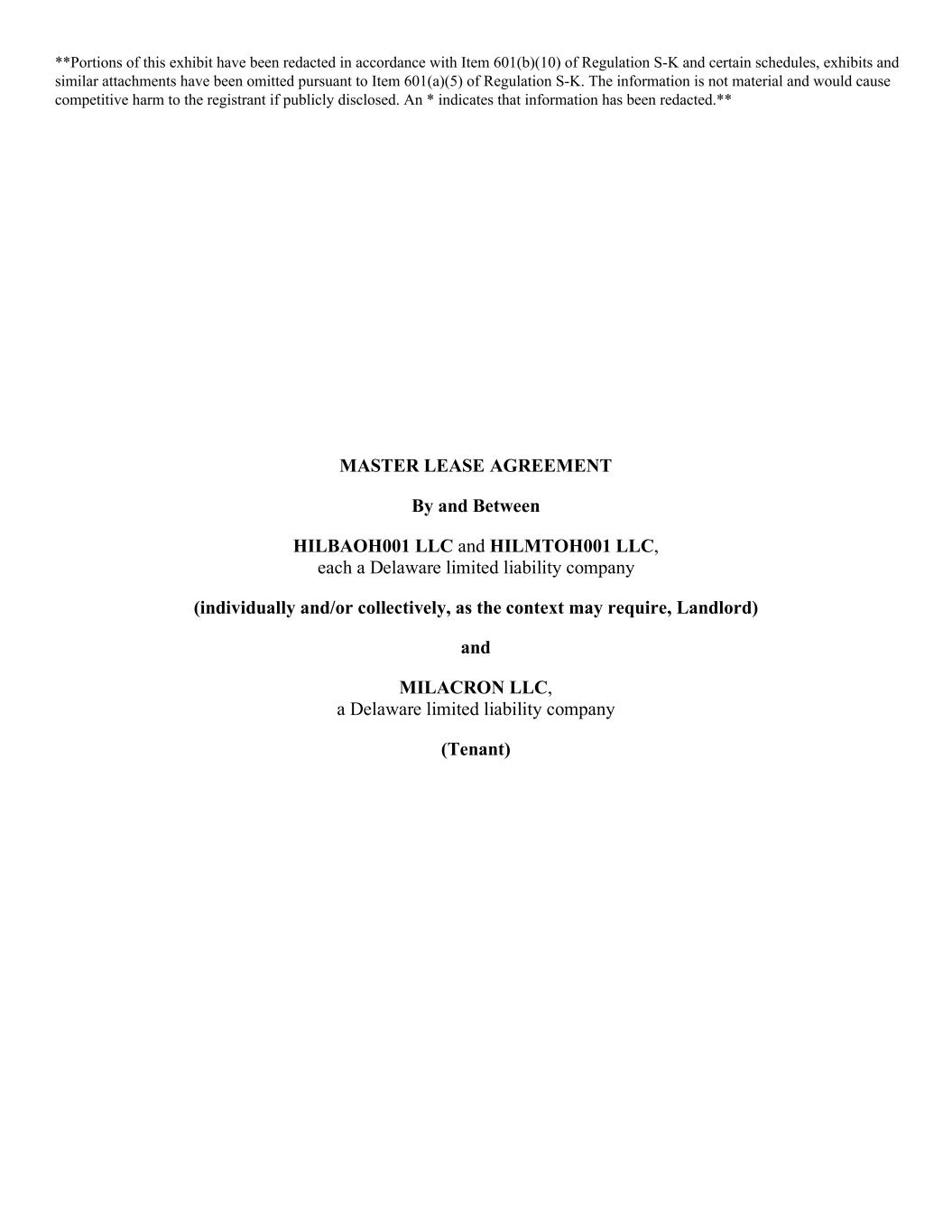MASTER LEASE AGREEMENT By and Between HILBAOH001 LLC and HILMTOH001 LLC, each a Delaware limited liability company (individually and/or collectively, as the context may require, Landlord) and MILACRON LLC, a Delaware limited liability company (Tenant) **Portions of this exhibit have been redacted in accordance with Item 601(b)(10) of Regulation S-K and certain schedules, exhibits and similar attachments have been omitted pursuant to Item 601(a)(5) of Regulation S-K. The information is not material and would cause competitive harm to the registrant if publicly disclosed. An * indicates that information has been redacted.**