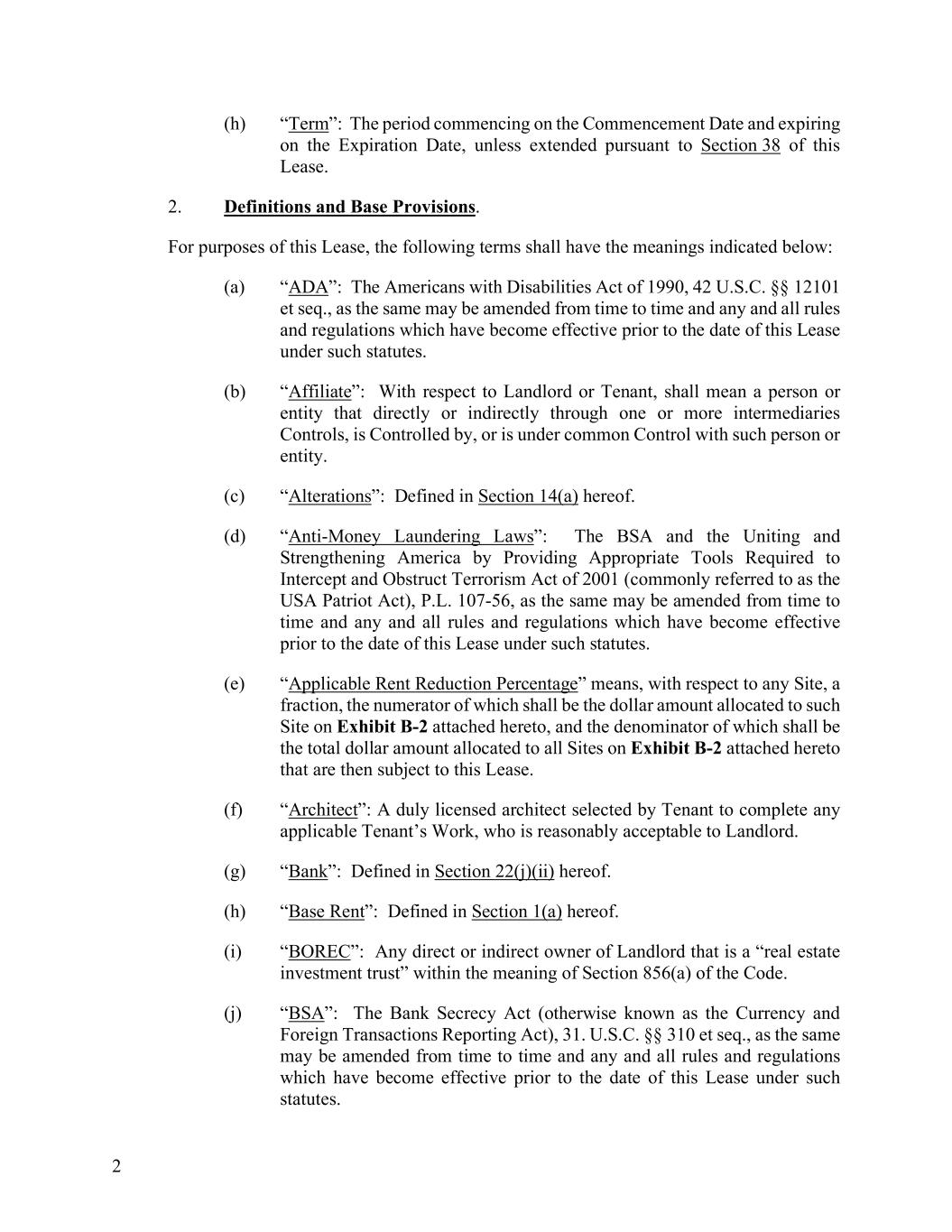 2 (h) “Term”: The period commencing on the Commencement Date and expiring on the Expiration Date, unless extended pursuant to Section 38 of this Lease. 2. Definitions and Base Provisions. For purposes of this Lease, the following terms shall have the meanings indicated below: (a) “ADA”: The Americans with Disabilities Act of 1990, 42 U.S.C. §§ 12101 et seq., as the same may be amended from time to time and any and all rules and regulations which have become effective prior to the date of this Lease under such statutes. (b) “Affiliate”: With respect to Landlord or Tenant, shall mean a person or entity that directly or indirectly through one or more intermediaries Controls, is Controlled by, or is under common Control with such person or entity. (c) “Alterations”: Defined in Section 14(a) hereof. (d) “Anti-Money Laundering Laws”: The BSA and the Uniting and Strengthening America by Providing Appropriate Tools Required to Intercept and Obstruct Terrorism Act of 2001 (commonly referred to as the USA Patriot Act), P.L. 107-56, as the same may be amended from time to time and any and all rules and regulations which have become effective prior to the date of this Lease under such statutes. (e) “Applicable Rent Reduction Percentage” means, with respect to any Site, a fraction, the numerator of which shall be the dollar amount allocated to such Site on Exhibit B-2 attached hereto, and the denominator of which shall be the total dollar amount allocated to all Sites on Exhibit B-2 attached hereto that are then subject to this Lease. (f) “Architect”: A duly licensed architect selected by Tenant to complete any applicable Tenant’s Work, who is reasonably acceptable to Landlord. (g) “Bank”: Defined in Section 22(j)(ii) hereof. (h) “Base Rent”: Defined in Section 1(a) hereof. (i) “BOREC”: Any direct or indirect owner of Landlord that is a “real estate investment trust” within the meaning of Section 856(a) of the Code. (j) “BSA”: The Bank Secrecy Act (otherwise known as the Currency and Foreign Transactions Reporting Act), 31. U.S.C. §§ 310 et seq., as the same may be amended from time to time and any and all rules and regulations which have become effective prior to the date of this Lease under such statutes.