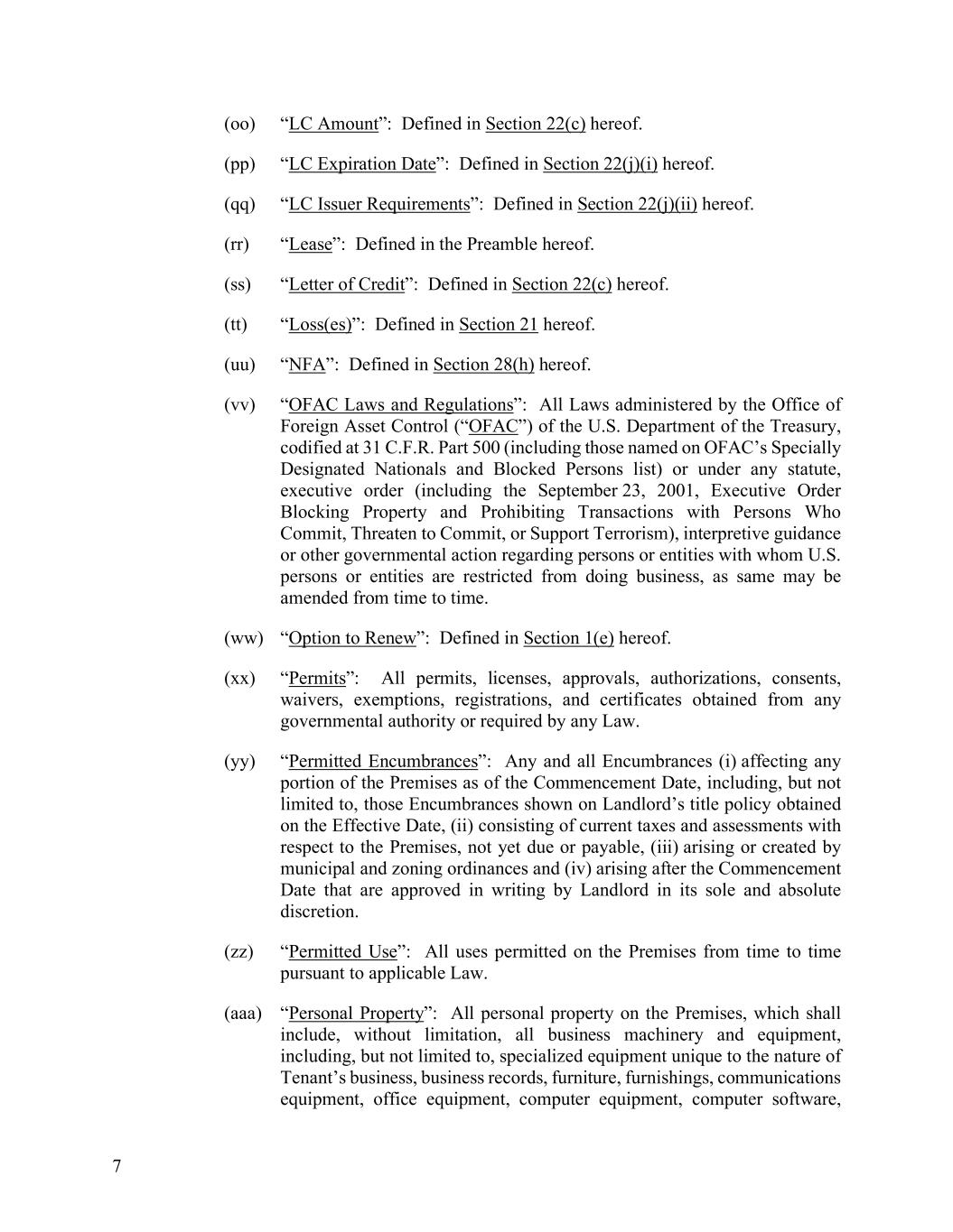 7 (oo) “LC Amount”: Defined in Section 22(c) hereof. (pp) “LC Expiration Date”: Defined in Section 22(j)(i) hereof. (qq) “LC Issuer Requirements”: Defined in Section 22(j)(ii) hereof. (rr) “Lease”: Defined in the Preamble hereof. (ss) “Letter of Credit”: Defined in Section 22(c) hereof. (tt) “Loss(es)”: Defined in Section 21 hereof. (uu) “NFA”: Defined in Section 28(h) hereof. (vv) “OFAC Laws and Regulations”: All Laws administered by the Office of Foreign Asset Control (“OFAC”) of the U.S. Department of the Treasury, codified at 31 C.F.R. Part 500 (including those named on OFAC’s Specially Designated Nationals and Blocked Persons list) or under any statute, executive order (including the September 23, 2001, Executive Order Blocking Property and Prohibiting Transactions with Persons Who Commit, Threaten to Commit, or Support Terrorism), interpretive guidance or other governmental action regarding persons or entities with whom U.S. persons or entities are restricted from doing business, as same may be amended from time to time. (ww) “Option to Renew”: Defined in Section 1(e) hereof. (xx) “Permits”: All permits, licenses, approvals, authorizations, consents, waivers, exemptions, registrations, and certificates obtained from any governmental authority or required by any Law. (yy) “Permitted Encumbrances”: Any and all Encumbrances (i) affecting any portion of the Premises as of the Commencement Date, including, but not limited to, those Encumbrances shown on Landlord’s title policy obtained on the Effective Date, (ii) consisting of current taxes and assessments with respect to the Premises, not yet due or payable, (iii) arising or created by municipal and zoning ordinances and (iv) arising after the Commencement Date that are approved in writing by Landlord in its sole and absolute discretion. (zz) “Permitted Use”: All uses permitted on the Premises from time to time pursuant to applicable Law. (aaa) “Personal Property”: All personal property on the Premises, which shall include, without limitation, all business machinery and equipment, including, but not limited to, specialized equipment unique to the nature of Tenant’s business, business records, furniture, furnishings, communications equipment, office equipment, computer equipment, computer software,