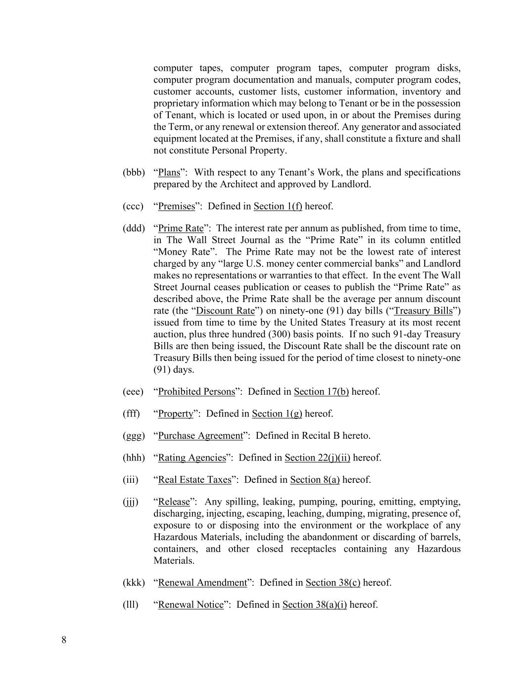 8 computer tapes, computer program tapes, computer program disks, computer program documentation and manuals, computer program codes, customer accounts, customer lists, customer information, inventory and proprietary information which may belong to Tenant or be in the possession of Tenant, which is located or used upon, in or about the Premises during the Term, or any renewal or extension thereof. Any generator and associated equipment located at the Premises, if any, shall constitute a fixture and shall not constitute Personal Property. (bbb) “Plans”: With respect to any Tenant’s Work, the plans and specifications prepared by the Architect and approved by Landlord. (ccc) “Premises”: Defined in Section 1(f) hereof. (ddd) “Prime Rate”: The interest rate per annum as published, from time to time, in The Wall Street Journal as the “Prime Rate” in its column entitled “Money Rate”. The Prime Rate may not be the lowest rate of interest charged by any “large U.S. money center commercial banks” and Landlord makes no representations or warranties to that effect. In the event The Wall Street Journal ceases publication or ceases to publish the “Prime Rate” as described above, the Prime Rate shall be the average per annum discount rate (the “Discount Rate”) on ninety-one (91) day bills (“Treasury Bills”) issued from time to time by the United States Treasury at its most recent auction, plus three hundred (300) basis points. If no such 91-day Treasury Bills are then being issued, the Discount Rate shall be the discount rate on Treasury Bills then being issued for the period of time closest to ninety-one (91) days. (eee) “Prohibited Persons”: Defined in Section 17(b) hereof. (fff) “Property”: Defined in Section 1(g) hereof. (ggg) “Purchase Agreement”: Defined in Recital B hereto. (hhh) “Rating Agencies”: Defined in Section 22(j)(ii) hereof. (iii) “Real Estate Taxes”: Defined in Section 8(a) hereof. (jjj) “Release”: Any spilling, leaking, pumping, pouring, emitting, emptying, discharging, injecting, escaping, leaching, dumping, migrating, presence of, exposure to or disposing into the environment or the workplace of any Hazardous Materials, including the abandonment or discarding of barrels, containers, and other closed receptacles containing any Hazardous Materials. (kkk) “Renewal Amendment”: Defined in Section 38(c) hereof. (lll) “Renewal Notice”: Defined in Section 38(a)(i) hereof.