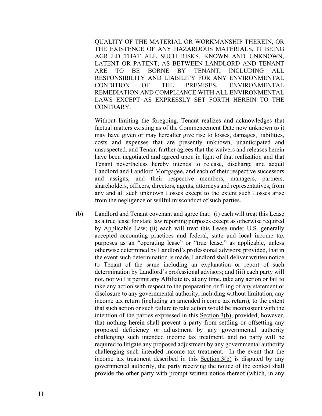 11 QUALITY OF THE MATERIAL OR WORKMANSHIP THEREIN, OR THE EXISTENCE OF ANY HAZARDOUS MATERIALS, IT BEING AGREED THAT ALL SUCH RISKS, KNOWN AND UNKNOWN, LATENT OR PATENT, AS BETWEEN LANDLORD AND TENANT ARE TO BE BORNE BY TENANT, INCLUDING ALL RESPONSIBILITY AND LIABILITY FOR ANY ENVIRONMENTAL CONDITION OF THE PREMISES, ENVIRONMENTAL REMEDIATION AND COMPLIANCE WITH ALL ENVIRONMENTAL LAWS EXCEPT AS EXPRESSLY SET FORTH HEREIN TO THE CONTRARY. Without limiting the foregoing, Tenant realizes and acknowledges that factual matters existing as of the Commencement Date now unknown to it may have given or may hereafter give rise to losses, damages, liabilities, costs and expenses that are presently unknown, unanticipated and unsuspected, and Tenant further agrees that the waivers and releases herein have been negotiated and agreed upon in light of that realization and that Tenant nevertheless hereby intends to release, discharge and acquit Landlord and Landlord Mortgagee, and each of their respective successors and assigns, and their respective members, managers, partners, shareholders, officers, directors, agents, attorneys and representatives, from any and all such unknown Losses except to the extent such Losses arise from the negligence or willful misconduct of such parties. (b) Landlord and Tenant covenant and agree that: (i) each will treat this Lease as a true lease for state law reporting purposes except as otherwise required by Applicable Law; (ii) each will treat this Lease under U.S. generally accepted accounting practices and federal, state and local income tax purposes as an “operating lease” or “true lease,” as applicable, unless otherwise determined by Landlord’s professional advisors; provided, that in the event such determination is made, Landlord shall deliver written notice to Tenant of the same including an explanation or report of such determination by Landlord’s professional advisors; and (iii) each party will not, nor will it permit any Affiliate to, at any time, take any action or fail to take any action with respect to the preparation or filing of any statement or disclosure to any governmental authority, including without limitation, any income tax return (including an amended income tax return), to the extent that such action or such failure to take action would be inconsistent with the intention of the parties expressed in this Section 3(b); provided, however, that nothing herein shall prevent a party from settling or offsetting any proposed deficiency or adjustment by any governmental authority challenging such intended income tax treatment, and no party will be required to litigate any proposed adjustment by any governmental authority challenging such intended income tax treatment. In the event that the income tax treatment described in this Section 3(b) is disputed by any governmental authority, the party receiving the notice of the contest shall provide the other party with prompt written notice thereof (which, in any