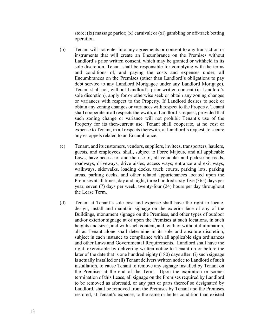 13 store; (ix) massage parlor; (x) carnival; or (xi) gambling or off-track betting operation. (b) Tenant will not enter into any agreements or consent to any transaction or instruments that will create an Encumbrance on the Premises without Landlord’s prior written consent, which may be granted or withheld in its sole discretion. Tenant shall be responsible for complying with the terms and conditions of, and paying the costs and expenses under, all Encumbrances on the Premises (other than Landlord’s obligations to pay debt service to any Landlord Mortgagee under any Landlord Mortgage). Tenant shall not, without Landlord’s prior written consent (in Landlord’s sole discretion), apply for or otherwise seek or obtain any zoning changes or variances with respect to the Property. If Landlord desires to seek or obtain any zoning changes or variances with respect to the Property, Tenant shall cooperate in all respects therewith, at Landlord’s request, provided that such zoning change or variance will not prohibit Tenant’s use of the Property for its then-current use. Tenant shall cooperate, at no cost or expense to Tenant, in all respects therewith, at Landlord’s request, to secure any estoppels related to an Encumbrance. (c) Tenant, and its customers, vendors, suppliers, invitees, transporters, haulers, guests, and employees, shall, subject to Force Majeure and all applicable Laws, have access to, and the use of, all vehicular and pedestrian roads, roadways, driveways, drive aisles, access ways, entrance and exit ways, walkways, sidewalks, loading docks, truck courts, parking lots, parking areas, parking decks, and other related appurtenances located upon the Premises at all times, day and night, three hundred sixty-five (365) days per year, seven (7) days per week, twenty-four (24) hours per day throughout the Lease Term. (d) Tenant at Tenant’s sole cost and expense shall have the right to locate, design, install and maintain signage on the exterior face of any of the Buildings, monument signage on the Premises, and other types of outdoor and/or exterior signage at or upon the Premises at such locations, in such heights and sizes, and with such content, and, with or without illumination, all as Tenant alone shall determine in its sole and absolute discretion, subject in each instance to compliance with all applicable sign ordinances and other Laws and Governmental Requirements. Landlord shall have the right, exercisable by delivering written notice to Tenant on or before the later of the date that is one hundred eighty (180) days after: (i) such signage is actually installed or (ii) Tenant delivers written notice to Landlord of such installation, to cause Tenant to remove any signage installed by Tenant on the Premises at the end of the Term. Upon the expiration or sooner termination of this Lease, all signage on the Premises required by Landlord to be removed as aforesaid, or any part or parts thereof so designated by Landlord, shall be removed from the Premises by Tenant and the Premises restored, at Tenant’s expense, to the same or better condition than existed