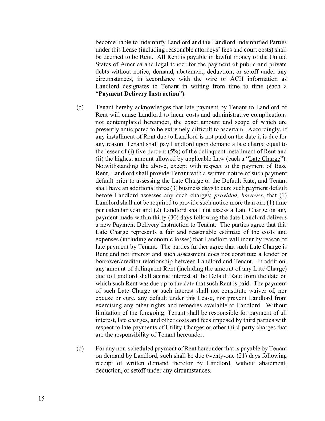 15 become liable to indemnify Landlord and the Landlord Indemnified Parties under this Lease (including reasonable attorneys’ fees and court costs) shall be deemed to be Rent. All Rent is payable in lawful money of the United States of America and legal tender for the payment of public and private debts without notice, demand, abatement, deduction, or setoff under any circumstances, in accordance with the wire or ACH information as Landlord designates to Tenant in writing from time to time (each a “Payment Delivery Instruction”). (c) Tenant hereby acknowledges that late payment by Tenant to Landlord of Rent will cause Landlord to incur costs and administrative complications not contemplated hereunder, the exact amount and scope of which are presently anticipated to be extremely difficult to ascertain. Accordingly, if any installment of Rent due to Landlord is not paid on the date it is due for any reason, Tenant shall pay Landlord upon demand a late charge equal to the lesser of (i) five percent (5%) of the delinquent installment of Rent and (ii) the highest amount allowed by applicable Law (each a “Late Charge”). Notwithstanding the above, except with respect to the payment of Base Rent, Landlord shall provide Tenant with a written notice of such payment default prior to assessing the Late Charge or the Default Rate, and Tenant shall have an additional three (3) business days to cure such payment default before Landlord assesses any such charges; provided, however, that (1) Landlord shall not be required to provide such notice more than one (1) time per calendar year and (2) Landlord shall not assess a Late Charge on any payment made within thirty (30) days following the date Landlord delivers a new Payment Delivery Instruction to Tenant. The parties agree that this Late Charge represents a fair and reasonable estimate of the costs and expenses (including economic losses) that Landlord will incur by reason of late payment by Tenant. The parties further agree that such Late Charge is Rent and not interest and such assessment does not constitute a lender or borrower/creditor relationship between Landlord and Tenant. In addition, any amount of delinquent Rent (including the amount of any Late Charge) due to Landlord shall accrue interest at the Default Rate from the date on which such Rent was due up to the date that such Rent is paid. The payment of such Late Charge or such interest shall not constitute waiver of, nor excuse or cure, any default under this Lease, nor prevent Landlord from exercising any other rights and remedies available to Landlord. Without limitation of the foregoing, Tenant shall be responsible for payment of all interest, late charges, and other costs and fees imposed by third parties with respect to late payments of Utility Charges or other third-party charges that are the responsibility of Tenant hereunder. (d) For any non-scheduled payment of Rent hereunder that is payable by Tenant on demand by Landlord, such shall be due twenty-one (21) days following receipt of written demand therefor by Landlord, without abatement, deduction, or setoff under any circumstances.
