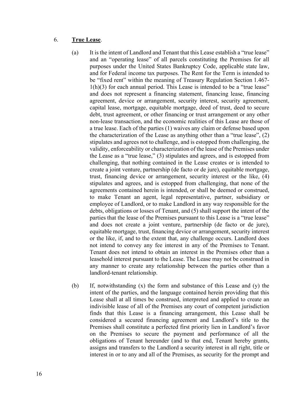 16 6. True Lease. (a) It is the intent of Landlord and Tenant that this Lease establish a “true lease” and an “operating lease” of all parcels constituting the Premises for all purposes under the United States Bankruptcy Code, applicable state law, and for Federal income tax purposes. The Rent for the Term is intended to be “fixed rent” within the meaning of Treasury Regulation Section 1.467- 1(h)(3) for each annual period. This Lease is intended to be a “true lease” and does not represent a financing statement, financing lease, financing agreement, device or arrangement, security interest, security agreement, capital lease, mortgage, equitable mortgage, deed of trust, deed to secure debt, trust agreement, or other financing or trust arrangement or any other non-lease transaction, and the economic realities of this Lease are those of a true lease. Each of the parties (1) waives any claim or defense based upon the characterization of the Lease as anything other than a “true lease”, (2) stipulates and agrees not to challenge, and is estopped from challenging, the validity, enforceability or characterization of the lease of the Premises under the Lease as a “true lease,” (3) stipulates and agrees, and is estopped from challenging, that nothing contained in the Lease creates or is intended to create a joint venture, partnership (de facto or de jure), equitable mortgage, trust, financing device or arrangement, security interest or the like, (4) stipulates and agrees, and is estopped from challenging, that none of the agreements contained herein is intended, or shall be deemed or construed, to make Tenant an agent, legal representative, partner, subsidiary or employee of Landlord, or to make Landlord in any way responsible for the debts, obligations or losses of Tenant, and (5) shall support the intent of the parties that the lease of the Premises pursuant to this Lease is a “true lease” and does not create a joint venture, partnership (de facto or de jure), equitable mortgage, trust, financing device or arrangement, security interest or the like, if, and to the extent that, any challenge occurs. Landlord does not intend to convey any fee interest in any of the Premises to Tenant. Tenant does not intend to obtain an interest in the Premises other than a leasehold interest pursuant to the Lease. The Lease may not be construed in any manner to create any relationship between the parties other than a landlord-tenant relationship. (b) If, notwithstanding (x) the form and substance of this Lease and (y) the intent of the parties, and the language contained herein providing that this Lease shall at all times be construed, interpreted and applied to create an indivisible lease of all of the Premises any court of competent jurisdiction finds that this Lease is a financing arrangement, this Lease shall be considered a secured financing agreement and Landlord’s title to the Premises shall constitute a perfected first priority lien in Landlord’s favor on the Premises to secure the payment and performance of all the obligations of Tenant hereunder (and to that end, Tenant hereby grants, assigns and transfers to the Landlord a security interest in all right, title or interest in or to any and all of the Premises, as security for the prompt and