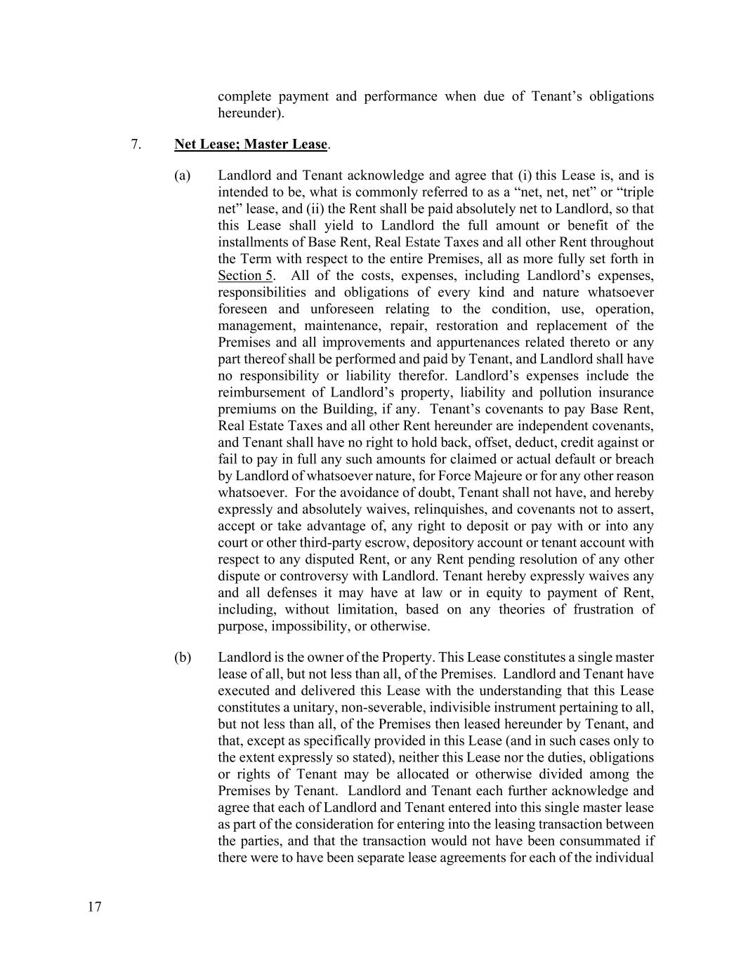 17 complete payment and performance when due of Tenant’s obligations hereunder). 7. Net Lease; Master Lease. (a) Landlord and Tenant acknowledge and agree that (i) this Lease is, and is intended to be, what is commonly referred to as a “net, net, net” or “triple net” lease, and (ii) the Rent shall be paid absolutely net to Landlord, so that this Lease shall yield to Landlord the full amount or benefit of the installments of Base Rent, Real Estate Taxes and all other Rent throughout the Term with respect to the entire Premises, all as more fully set forth in Section 5. All of the costs, expenses, including Landlord’s expenses, responsibilities and obligations of every kind and nature whatsoever foreseen and unforeseen relating to the condition, use, operation, management, maintenance, repair, restoration and replacement of the Premises and all improvements and appurtenances related thereto or any part thereof shall be performed and paid by Tenant, and Landlord shall have no responsibility or liability therefor. Landlord’s expenses include the reimbursement of Landlord’s property, liability and pollution insurance premiums on the Building, if any. Tenant’s covenants to pay Base Rent, Real Estate Taxes and all other Rent hereunder are independent covenants, and Tenant shall have no right to hold back, offset, deduct, credit against or fail to pay in full any such amounts for claimed or actual default or breach by Landlord of whatsoever nature, for Force Majeure or for any other reason whatsoever. For the avoidance of doubt, Tenant shall not have, and hereby expressly and absolutely waives, relinquishes, and covenants not to assert, accept or take advantage of, any right to deposit or pay with or into any court or other third-party escrow, depository account or tenant account with respect to any disputed Rent, or any Rent pending resolution of any other dispute or controversy with Landlord. Tenant hereby expressly waives any and all defenses it may have at law or in equity to payment of Rent, including, without limitation, based on any theories of frustration of purpose, impossibility, or otherwise. (b) Landlord is the owner of the Property. This Lease constitutes a single master lease of all, but not less than all, of the Premises. Landlord and Tenant have executed and delivered this Lease with the understanding that this Lease constitutes a unitary, non-severable, indivisible instrument pertaining to all, but not less than all, of the Premises then leased hereunder by Tenant, and that, except as specifically provided in this Lease (and in such cases only to the extent expressly so stated), neither this Lease nor the duties, obligations or rights of Tenant may be allocated or otherwise divided among the Premises by Tenant. Landlord and Tenant each further acknowledge and agree that each of Landlord and Tenant entered into this single master lease as part of the consideration for entering into the leasing transaction between the parties, and that the transaction would not have been consummated if there were to have been separate lease agreements for each of the individual