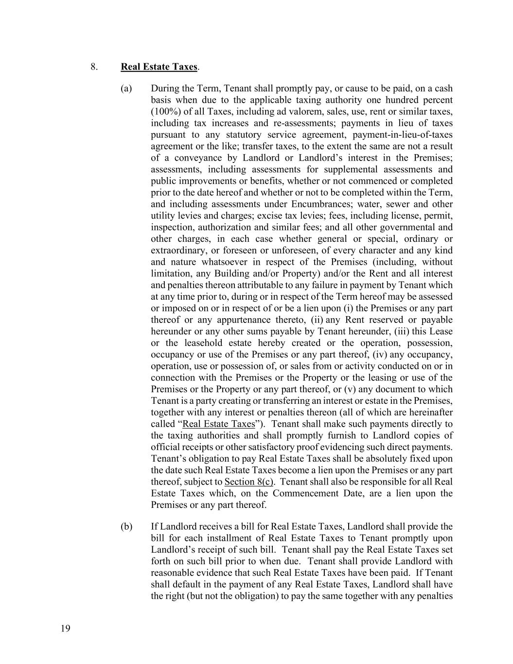 19 8. Real Estate Taxes. (a) During the Term, Tenant shall promptly pay, or cause to be paid, on a cash basis when due to the applicable taxing authority one hundred percent (100%) of all Taxes, including ad valorem, sales, use, rent or similar taxes, including tax increases and re-assessments; payments in lieu of taxes pursuant to any statutory service agreement, payment-in-lieu-of-taxes agreement or the like; transfer taxes, to the extent the same are not a result of a conveyance by Landlord or Landlord’s interest in the Premises; assessments, including assessments for supplemental assessments and public improvements or benefits, whether or not commenced or completed prior to the date hereof and whether or not to be completed within the Term, and including assessments under Encumbrances; water, sewer and other utility levies and charges; excise tax levies; fees, including license, permit, inspection, authorization and similar fees; and all other governmental and other charges, in each case whether general or special, ordinary or extraordinary, or foreseen or unforeseen, of every character and any kind and nature whatsoever in respect of the Premises (including, without limitation, any Building and/or Property) and/or the Rent and all interest and penalties thereon attributable to any failure in payment by Tenant which at any time prior to, during or in respect of the Term hereof may be assessed or imposed on or in respect of or be a lien upon (i) the Premises or any part thereof or any appurtenance thereto, (ii) any Rent reserved or payable hereunder or any other sums payable by Tenant hereunder, (iii) this Lease or the leasehold estate hereby created or the operation, possession, occupancy or use of the Premises or any part thereof, (iv) any occupancy, operation, use or possession of, or sales from or activity conducted on or in connection with the Premises or the Property or the leasing or use of the Premises or the Property or any part thereof, or (v) any document to which Tenant is a party creating or transferring an interest or estate in the Premises, together with any interest or penalties thereon (all of which are hereinafter called “Real Estate Taxes”). Tenant shall make such payments directly to the taxing authorities and shall promptly furnish to Landlord copies of official receipts or other satisfactory proof evidencing such direct payments. Tenant’s obligation to pay Real Estate Taxes shall be absolutely fixed upon the date such Real Estate Taxes become a lien upon the Premises or any part thereof, subject to Section 8(c). Tenant shall also be responsible for all Real Estate Taxes which, on the Commencement Date, are a lien upon the Premises or any part thereof. (b) If Landlord receives a bill for Real Estate Taxes, Landlord shall provide the bill for each installment of Real Estate Taxes to Tenant promptly upon Landlord’s receipt of such bill. Tenant shall pay the Real Estate Taxes set forth on such bill prior to when due. Tenant shall provide Landlord with reasonable evidence that such Real Estate Taxes have been paid. If Tenant shall default in the payment of any Real Estate Taxes, Landlord shall have the right (but not the obligation) to pay the same together with any penalties