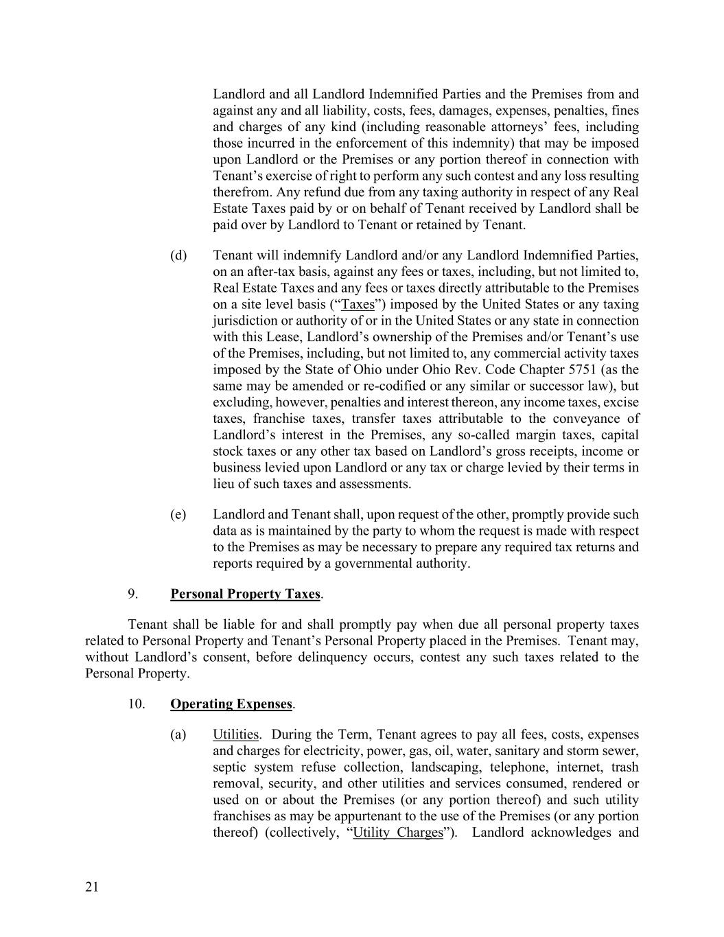 21 Landlord and all Landlord Indemnified Parties and the Premises from and against any and all liability, costs, fees, damages, expenses, penalties, fines and charges of any kind (including reasonable attorneys’ fees, including those incurred in the enforcement of this indemnity) that may be imposed upon Landlord or the Premises or any portion thereof in connection with Tenant’s exercise of right to perform any such contest and any loss resulting therefrom. Any refund due from any taxing authority in respect of any Real Estate Taxes paid by or on behalf of Tenant received by Landlord shall be paid over by Landlord to Tenant or retained by Tenant. (d) Tenant will indemnify Landlord and/or any Landlord Indemnified Parties, on an after-tax basis, against any fees or taxes, including, but not limited to, Real Estate Taxes and any fees or taxes directly attributable to the Premises on a site level basis (“Taxes”) imposed by the United States or any taxing jurisdiction or authority of or in the United States or any state in connection with this Lease, Landlord’s ownership of the Premises and/or Tenant’s use of the Premises, including, but not limited to, any commercial activity taxes imposed by the State of Ohio under Ohio Rev. Code Chapter 5751 (as the same may be amended or re-codified or any similar or successor law), but excluding, however, penalties and interest thereon, any income taxes, excise taxes, franchise taxes, transfer taxes attributable to the conveyance of Landlord’s interest in the Premises, any so-called margin taxes, capital stock taxes or any other tax based on Landlord’s gross receipts, income or business levied upon Landlord or any tax or charge levied by their terms in lieu of such taxes and assessments. (e) Landlord and Tenant shall, upon request of the other, promptly provide such data as is maintained by the party to whom the request is made with respect to the Premises as may be necessary to prepare any required tax returns and reports required by a governmental authority. 9. Personal Property Taxes. Tenant shall be liable for and shall promptly pay when due all personal property taxes related to Personal Property and Tenant’s Personal Property placed in the Premises. Tenant may, without Landlord’s consent, before delinquency occurs, contest any such taxes related to the Personal Property. 10. Operating Expenses. (a) Utilities. During the Term, Tenant agrees to pay all fees, costs, expenses and charges for electricity, power, gas, oil, water, sanitary and storm sewer, septic system refuse collection, landscaping, telephone, internet, trash removal, security, and other utilities and services consumed, rendered or used on or about the Premises (or any portion thereof) and such utility franchises as may be appurtenant to the use of the Premises (or any portion thereof) (collectively, “Utility Charges”). Landlord acknowledges and