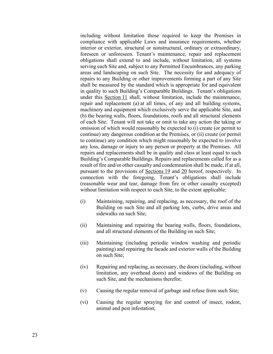 23 including without limitation those required to keep the Premises in compliance with applicable Laws and insurance requirements, whether interior or exterior, structural or nonstructural, ordinary or extraordinary, foreseen or unforeseen. Tenant’s maintenance, repair and replacement obligations shall extend to and include, without limitation, all systems serving each Site and, subject to any Permitted Encumbrances, any parking areas and landscaping on such Site. The necessity for and adequacy of repairs to any Building or other improvements forming a part of any Site shall be measured by the standard which is appropriate for and equivalent in quality to such Building’s Comparable Buildings. Tenant’s obligations under this Section 11 shall, without limitation, include the maintenance, repair and replacement (a) at all times, of any and all building systems, machinery and equipment which exclusively serve the applicable Site, and (b) the bearing walls, floors, foundations, roofs and all structural elements of each Site. Tenant will not take or omit to take any action the taking or omission of which would reasonably be expected to (i) create (or permit to continue) any dangerous condition at the Premises, or (ii) create (or permit to continue) any condition which might reasonably be expected to involve any loss, damage or injury to any person or property at the Premises. All repairs and replacements shall be in quality and class at least equal to such Building’s Comparable Buildings. Repairs and replacements called for as a result of fire and/or other casualty and condemnation shall be made, if at all, pursuant to the provisions of Sections 19 and 20 hereof, respectively. In connection with the foregoing, Tenant’s obligations shall include (reasonable wear and tear, damage from fire or other casualty excepted) without limitation with respect to each Site, to the extent applicable: (i) Maintaining, repairing, and replacing, as necessary, the roof of the Building on such Site and all parking lots, curbs, drive areas and sidewalks on such Site; (ii) Maintaining and repairing the bearing walls, floors, foundations, and all structural elements of the Building on such Site; (iii) Maintaining (including periodic window washing and periodic painting) and repairing the facade and exterior walls of the Building on such Site; (iv) Repairing and replacing, as necessary, the doors (including, without limitation, any overhead doors) and windows of the Building on such Site, and the mechanisms therefor; (v) Causing the regular removal of garbage and refuse from such Site; (vi) Causing the regular spraying for and control of insect, rodent, animal and pest infestation;