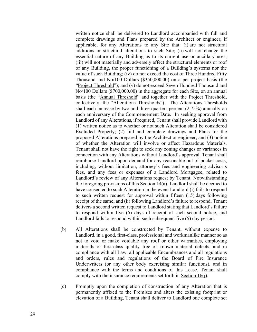 29 written notice shall be delivered to Landlord accompanied with full and complete drawings and Plans prepared by the Architect or engineer, if applicable, for any Alterations to any Site that: (i) are not structural additions or structural alterations to such Site; (ii) will not change the essential nature of any Building as to its current use or ancillary uses; (iii) will not materially and adversely affect the structural elements or roof of any Building, the proper functioning of a Building’s systems nor the value of such Building; (iv) do not exceed the cost of Three Hundred Fifty Thousand and No/100 Dollars ($350,000.00) on a per project basis (the “Project Threshold”); and (v) do not exceed Seven Hundred Thousand and No/100 Dollars ($700,000.00) in the aggregate for each Site, on an annual basis (the “Annual Threshold” and together with the Project Threshold, collectively, the “Alterations Thresholds”). The Alterations Thresholds shall each increase by two and three-quarters percent (2.75%) annually on each anniversary of the Commencement Date. In seeking approval from Landlord of any Alterations, if required, Tenant shall provide Landlord with (1) written notice as to whether or not such Alteration shall be considered Excluded Property; (2) full and complete drawings and Plans for the proposed Alterations prepared by the Architect or engineer; and (3) notice of whether the Alteration will involve or affect Hazardous Materials. Tenant shall not have the right to seek any zoning changes or variances in connection with any Alterations without Landlord’s approval. Tenant shall reimburse Landlord upon demand for any reasonable out-of-pocket costs, including, without limitation, attorney’s fees and engineering advisor’s fees, and any fees or expenses of a Landlord Mortgagee, related to Landlord’s review of any Alterations request by Tenant. Notwithstanding the foregoing provisions of this Section 14(a), Landlord shall be deemed to have consented to such Alteration in the event Landlord (i) fails to respond to such written request for approval within fifteen (15) days following receipt of the same; and (ii) following Landlord’s failure to respond, Tenant delivers a second written request to Landlord stating that Landlord’s failure to respond within five (5) days of receipt of such second notice, and Landlord fails to respond within such subsequent five (5) day period. (b) All Alterations shall be constructed by Tenant, without expense to Landlord, in a good, first-class, professional and workmanlike manner so as not to void or make voidable any roof or other warranties, employing materials of first-class quality free of known material defects, and in compliance with all Law, all applicable Encumbrances and all regulations and orders, rules and regulations of the Board of Fire Insurance Underwriters (or any other body exercising similar functions), and in compliance with the terms and conditions of this Lease. Tenant shall comply with the insurance requirements set forth in Section 16(j). (c) Promptly upon the completion of construction of any Alteration that is permanently affixed to the Premises and alters the existing footprint or elevation of a Building, Tenant shall deliver to Landlord one complete set
