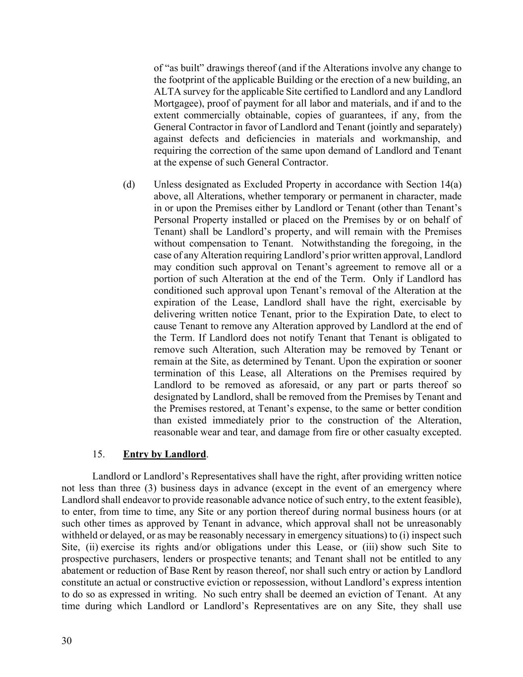30 of “as built” drawings thereof (and if the Alterations involve any change to the footprint of the applicable Building or the erection of a new building, an ALTA survey for the applicable Site certified to Landlord and any Landlord Mortgagee), proof of payment for all labor and materials, and if and to the extent commercially obtainable, copies of guarantees, if any, from the General Contractor in favor of Landlord and Tenant (jointly and separately) against defects and deficiencies in materials and workmanship, and requiring the correction of the same upon demand of Landlord and Tenant at the expense of such General Contractor. (d) Unless designated as Excluded Property in accordance with Section 14(a) above, all Alterations, whether temporary or permanent in character, made in or upon the Premises either by Landlord or Tenant (other than Tenant’s Personal Property installed or placed on the Premises by or on behalf of Tenant) shall be Landlord’s property, and will remain with the Premises without compensation to Tenant. Notwithstanding the foregoing, in the case of any Alteration requiring Landlord’s prior written approval, Landlord may condition such approval on Tenant’s agreement to remove all or a portion of such Alteration at the end of the Term. Only if Landlord has conditioned such approval upon Tenant’s removal of the Alteration at the expiration of the Lease, Landlord shall have the right, exercisable by delivering written notice Tenant, prior to the Expiration Date, to elect to cause Tenant to remove any Alteration approved by Landlord at the end of the Term. If Landlord does not notify Tenant that Tenant is obligated to remove such Alteration, such Alteration may be removed by Tenant or remain at the Site, as determined by Tenant. Upon the expiration or sooner termination of this Lease, all Alterations on the Premises required by Landlord to be removed as aforesaid, or any part or parts thereof so designated by Landlord, shall be removed from the Premises by Tenant and the Premises restored, at Tenant’s expense, to the same or better condition than existed immediately prior to the construction of the Alteration, reasonable wear and tear, and damage from fire or other casualty excepted. 15. Entry by Landlord. Landlord or Landlord’s Representatives shall have the right, after providing written notice not less than three (3) business days in advance (except in the event of an emergency where Landlord shall endeavor to provide reasonable advance notice of such entry, to the extent feasible), to enter, from time to time, any Site or any portion thereof during normal business hours (or at such other times as approved by Tenant in advance, which approval shall not be unreasonably withheld or delayed, or as may be reasonably necessary in emergency situations) to (i) inspect such Site, (ii) exercise its rights and/or obligations under this Lease, or (iii) show such Site to prospective purchasers, lenders or prospective tenants; and Tenant shall not be entitled to any abatement or reduction of Base Rent by reason thereof, nor shall such entry or action by Landlord constitute an actual or constructive eviction or repossession, without Landlord’s express intention to do so as expressed in writing. No such entry shall be deemed an eviction of Tenant. At any time during which Landlord or Landlord’s Representatives are on any Site, they shall use
