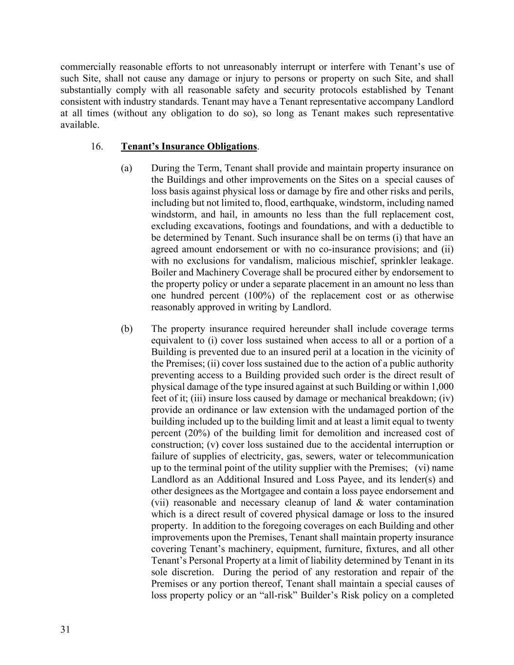 31 commercially reasonable efforts to not unreasonably interrupt or interfere with Tenant’s use of such Site, shall not cause any damage or injury to persons or property on such Site, and shall substantially comply with all reasonable safety and security protocols established by Tenant consistent with industry standards. Tenant may have a Tenant representative accompany Landlord at all times (without any obligation to do so), so long as Tenant makes such representative available. 16. Tenant’s Insurance Obligations. (a) During the Term, Tenant shall provide and maintain property insurance on the Buildings and other improvements on the Sites on a special causes of loss basis against physical loss or damage by fire and other risks and perils, including but not limited to, flood, earthquake, windstorm, including named windstorm, and hail, in amounts no less than the full replacement cost, excluding excavations, footings and foundations, and with a deductible to be determined by Tenant. Such insurance shall be on terms (i) that have an agreed amount endorsement or with no co-insurance provisions; and (ii) with no exclusions for vandalism, malicious mischief, sprinkler leakage. Boiler and Machinery Coverage shall be procured either by endorsement to the property policy or under a separate placement in an amount no less than one hundred percent (100%) of the replacement cost or as otherwise reasonably approved in writing by Landlord. (b) The property insurance required hereunder shall include coverage terms equivalent to (i) cover loss sustained when access to all or a portion of a Building is prevented due to an insured peril at a location in the vicinity of the Premises; (ii) cover loss sustained due to the action of a public authority preventing access to a Building provided such order is the direct result of physical damage of the type insured against at such Building or within 1,000 feet of it; (iii) insure loss caused by damage or mechanical breakdown; (iv) provide an ordinance or law extension with the undamaged portion of the building included up to the building limit and at least a limit equal to twenty percent (20%) of the building limit for demolition and increased cost of construction; (v) cover loss sustained due to the accidental interruption or failure of supplies of electricity, gas, sewers, water or telecommunication up to the terminal point of the utility supplier with the Premises; (vi) name Landlord as an Additional Insured and Loss Payee, and its lender(s) and other designees as the Mortgagee and contain a loss payee endorsement and (vii) reasonable and necessary cleanup of land & water contamination which is a direct result of covered physical damage or loss to the insured property. In addition to the foregoing coverages on each Building and other improvements upon the Premises, Tenant shall maintain property insurance covering Tenant’s machinery, equipment, furniture, fixtures, and all other Tenant’s Personal Property at a limit of liability determined by Tenant in its sole discretion. During the period of any restoration and repair of the Premises or any portion thereof, Tenant shall maintain a special causes of loss property policy or an “all-risk” Builder’s Risk policy on a completed