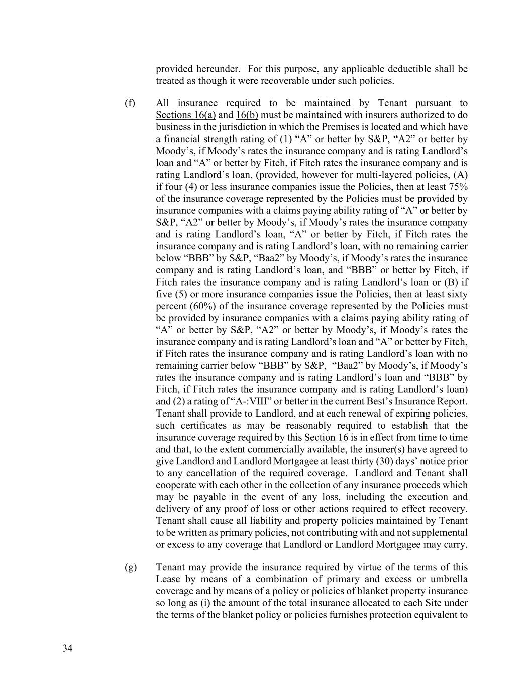 34 provided hereunder. For this purpose, any applicable deductible shall be treated as though it were recoverable under such policies. (f) All insurance required to be maintained by Tenant pursuant to Sections 16(a) and 16(b) must be maintained with insurers authorized to do business in the jurisdiction in which the Premises is located and which have a financial strength rating of (1) “A” or better by S&P, “A2” or better by Moody’s, if Moody’s rates the insurance company and is rating Landlord’s loan and “A” or better by Fitch, if Fitch rates the insurance company and is rating Landlord’s loan, (provided, however for multi-layered policies, (A) if four (4) or less insurance companies issue the Policies, then at least 75% of the insurance coverage represented by the Policies must be provided by insurance companies with a claims paying ability rating of “A” or better by S&P, “A2” or better by Moody’s, if Moody’s rates the insurance company and is rating Landlord’s loan, “A” or better by Fitch, if Fitch rates the insurance company and is rating Landlord’s loan, with no remaining carrier below “BBB” by S&P, “Baa2” by Moody’s, if Moody’s rates the insurance company and is rating Landlord’s loan, and “BBB” or better by Fitch, if Fitch rates the insurance company and is rating Landlord’s loan or (B) if five (5) or more insurance companies issue the Policies, then at least sixty percent (60%) of the insurance coverage represented by the Policies must be provided by insurance companies with a claims paying ability rating of “A” or better by S&P, “A2” or better by Moody’s, if Moody’s rates the insurance company and is rating Landlord’s loan and “A” or better by Fitch, if Fitch rates the insurance company and is rating Landlord’s loan with no remaining carrier below “BBB” by S&P, “Baa2” by Moody’s, if Moody’s rates the insurance company and is rating Landlord’s loan and “BBB” by Fitch, if Fitch rates the insurance company and is rating Landlord’s loan) and (2) a rating of “A-:VIII” or better in the current Best’s Insurance Report. Tenant shall provide to Landlord, and at each renewal of expiring policies, such certificates as may be reasonably required to establish that the insurance coverage required by this Section 16 is in effect from time to time and that, to the extent commercially available, the insurer(s) have agreed to give Landlord and Landlord Mortgagee at least thirty (30) days’ notice prior to any cancellation of the required coverage. Landlord and Tenant shall cooperate with each other in the collection of any insurance proceeds which may be payable in the event of any loss, including the execution and delivery of any proof of loss or other actions required to effect recovery. Tenant shall cause all liability and property policies maintained by Tenant to be written as primary policies, not contributing with and not supplemental or excess to any coverage that Landlord or Landlord Mortgagee may carry. (g) Tenant may provide the insurance required by virtue of the terms of this Lease by means of a combination of primary and excess or umbrella coverage and by means of a policy or policies of blanket property insurance so long as (i) the amount of the total insurance allocated to each Site under the terms of the blanket policy or policies furnishes protection equivalent to