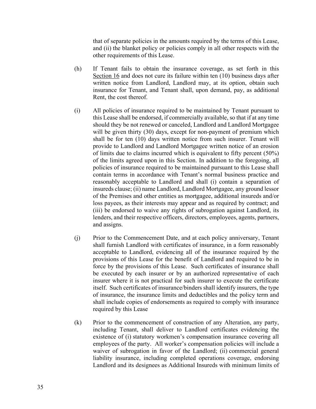 35 that of separate policies in the amounts required by the terms of this Lease, and (ii) the blanket policy or policies comply in all other respects with the other requirements of this Lease. (h) If Tenant fails to obtain the insurance coverage, as set forth in this Section 16 and does not cure its failure within ten (10) business days after written notice from Landlord, Landlord may, at its option, obtain such insurance for Tenant, and Tenant shall, upon demand, pay, as additional Rent, the cost thereof. (i) All policies of insurance required to be maintained by Tenant pursuant to this Lease shall be endorsed, if commercially available, so that if at any time should they be not renewed or canceled, Landlord and Landlord Mortgagee will be given thirty (30) days, except for non-payment of premium which shall be for ten (10) days written notice from such insurer. Tenant will provide to Landlord and Landlord Mortgagee written notice of an erosion of limits due to claims incurred which is equivalent to fifty percent (50%) of the limits agreed upon in this Section. In addition to the foregoing, all policies of insurance required to be maintained pursuant to this Lease shall contain terms in accordance with Tenant’s normal business practice and reasonably acceptable to Landlord and shall (i) contain a separation of insureds clause; (ii) name Landlord, Landlord Mortgagee, any ground lessor of the Premises and other entities as mortgagee, additional insureds and/or loss payees, as their interests may appear and as required by contract; and (iii) be endorsed to waive any rights of subrogation against Landlord, its lenders, and their respective officers, directors, employees, agents, partners, and assigns. (j) Prior to the Commencement Date, and at each policy anniversary, Tenant shall furnish Landlord with certificates of insurance, in a form reasonably acceptable to Landlord, evidencing all of the insurance required by the provisions of this Lease for the benefit of Landlord and required to be in force by the provisions of this Lease. Such certificates of insurance shall be executed by each insurer or by an authorized representative of each insurer where it is not practical for such insurer to execute the certificate itself. Such certificates of insurance/binders shall identify insurers, the type of insurance, the insurance limits and deductibles and the policy term and shall include copies of endorsements as required to comply with insurance required by this Lease (k) Prior to the commencement of construction of any Alteration, any party, including Tenant, shall deliver to Landlord certificates evidencing the existence of (i) statutory workmen’s compensation insurance covering all employees of the party. All worker’s compensation policies will include a waiver of subrogation in favor of the Landlord; (ii) commercial general liability insurance, including completed operations coverage, endorsing Landlord and its designees as Additional Insureds with minimum limits of