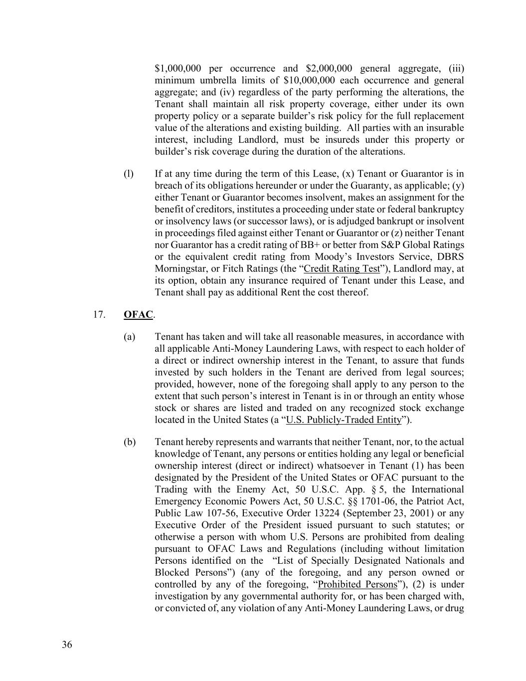 36 $1,000,000 per occurrence and $2,000,000 general aggregate, (iii) minimum umbrella limits of $10,000,000 each occurrence and general aggregate; and (iv) regardless of the party performing the alterations, the Tenant shall maintain all risk property coverage, either under its own property policy or a separate builder’s risk policy for the full replacement value of the alterations and existing building. All parties with an insurable interest, including Landlord, must be insureds under this property or builder’s risk coverage during the duration of the alterations. (l) If at any time during the term of this Lease, (x) Tenant or Guarantor is in breach of its obligations hereunder or under the Guaranty, as applicable; (y) either Tenant or Guarantor becomes insolvent, makes an assignment for the benefit of creditors, institutes a proceeding under state or federal bankruptcy or insolvency laws (or successor laws), or is adjudged bankrupt or insolvent in proceedings filed against either Tenant or Guarantor or (z) neither Tenant nor Guarantor has a credit rating of BB+ or better from S&P Global Ratings or the equivalent credit rating from Moody’s Investors Service, DBRS Morningstar, or Fitch Ratings (the “Credit Rating Test”), Landlord may, at its option, obtain any insurance required of Tenant under this Lease, and Tenant shall pay as additional Rent the cost thereof. 17. OFAC. (a) Tenant has taken and will take all reasonable measures, in accordance with all applicable Anti-Money Laundering Laws, with respect to each holder of a direct or indirect ownership interest in the Tenant, to assure that funds invested by such holders in the Tenant are derived from legal sources; provided, however, none of the foregoing shall apply to any person to the extent that such person’s interest in Tenant is in or through an entity whose stock or shares are listed and traded on any recognized stock exchange located in the United States (a “U.S. Publicly-Traded Entity”). (b) Tenant hereby represents and warrants that neither Tenant, nor, to the actual knowledge of Tenant, any persons or entities holding any legal or beneficial ownership interest (direct or indirect) whatsoever in Tenant (1) has been designated by the President of the United States or OFAC pursuant to the Trading with the Enemy Act, 50 U.S.C. App. § 5, the International Emergency Economic Powers Act, 50 U.S.C. §§ 1701-06, the Patriot Act, Public Law 107-56, Executive Order 13224 (September 23, 2001) or any Executive Order of the President issued pursuant to such statutes; or otherwise a person with whom U.S. Persons are prohibited from dealing pursuant to OFAC Laws and Regulations (including without limitation Persons identified on the “List of Specially Designated Nationals and Blocked Persons”) (any of the foregoing, and any person owned or controlled by any of the foregoing, “Prohibited Persons”), (2) is under investigation by any governmental authority for, or has been charged with, or convicted of, any violation of any Anti-Money Laundering Laws, or drug
