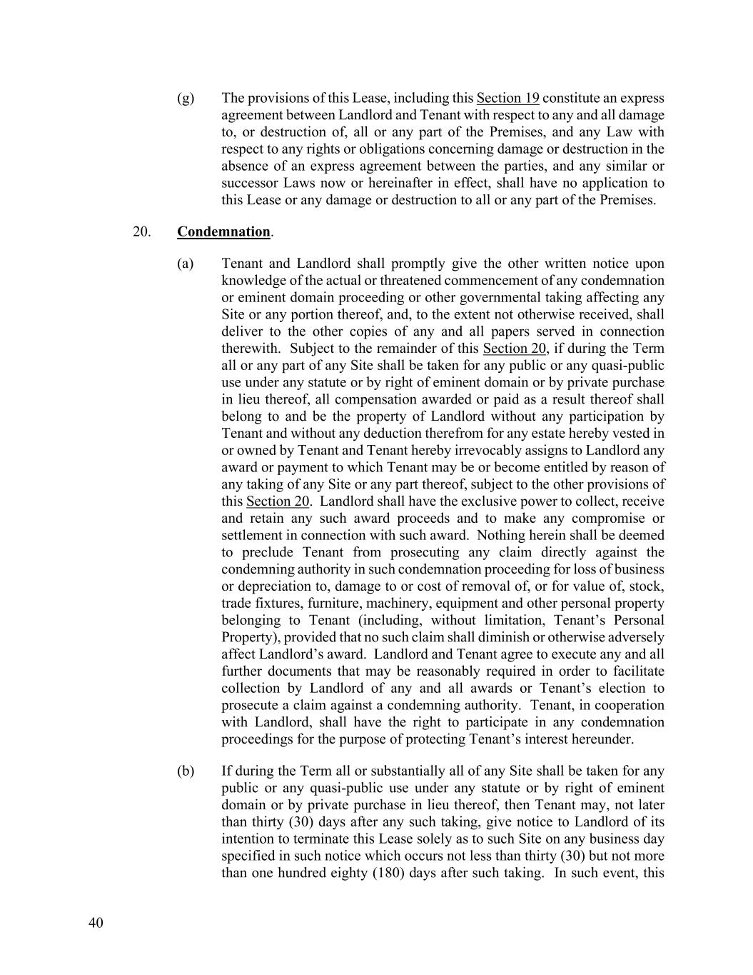 40 (g) The provisions of this Lease, including this Section 19 constitute an express agreement between Landlord and Tenant with respect to any and all damage to, or destruction of, all or any part of the Premises, and any Law with respect to any rights or obligations concerning damage or destruction in the absence of an express agreement between the parties, and any similar or successor Laws now or hereinafter in effect, shall have no application to this Lease or any damage or destruction to all or any part of the Premises. 20. Condemnation. (a) Tenant and Landlord shall promptly give the other written notice upon knowledge of the actual or threatened commencement of any condemnation or eminent domain proceeding or other governmental taking affecting any Site or any portion thereof, and, to the extent not otherwise received, shall deliver to the other copies of any and all papers served in connection therewith. Subject to the remainder of this Section 20, if during the Term all or any part of any Site shall be taken for any public or any quasi-public use under any statute or by right of eminent domain or by private purchase in lieu thereof, all compensation awarded or paid as a result thereof shall belong to and be the property of Landlord without any participation by Tenant and without any deduction therefrom for any estate hereby vested in or owned by Tenant and Tenant hereby irrevocably assigns to Landlord any award or payment to which Tenant may be or become entitled by reason of any taking of any Site or any part thereof, subject to the other provisions of this Section 20. Landlord shall have the exclusive power to collect, receive and retain any such award proceeds and to make any compromise or settlement in connection with such award. Nothing herein shall be deemed to preclude Tenant from prosecuting any claim directly against the condemning authority in such condemnation proceeding for loss of business or depreciation to, damage to or cost of removal of, or for value of, stock, trade fixtures, furniture, machinery, equipment and other personal property belonging to Tenant (including, without limitation, Tenant’s Personal Property), provided that no such claim shall diminish or otherwise adversely affect Landlord’s award. Landlord and Tenant agree to execute any and all further documents that may be reasonably required in order to facilitate collection by Landlord of any and all awards or Tenant’s election to prosecute a claim against a condemning authority. Tenant, in cooperation with Landlord, shall have the right to participate in any condemnation proceedings for the purpose of protecting Tenant’s interest hereunder. (b) If during the Term all or substantially all of any Site shall be taken for any public or any quasi-public use under any statute or by right of eminent domain or by private purchase in lieu thereof, then Tenant may, not later than thirty (30) days after any such taking, give notice to Landlord of its intention to terminate this Lease solely as to such Site on any business day specified in such notice which occurs not less than thirty (30) but not more than one hundred eighty (180) days after such taking. In such event, this
