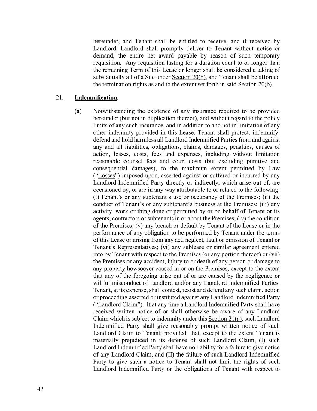 42 hereunder, and Tenant shall be entitled to receive, and if received by Landlord, Landlord shall promptly deliver to Tenant without notice or demand, the entire net award payable by reason of such temporary requisition. Any requisition lasting for a duration equal to or longer than the remaining Term of this Lease or longer shall be considered a taking of substantially all of a Site under Section 20(b), and Tenant shall be afforded the termination rights as and to the extent set forth in said Section 20(b). 21. Indemnification. (a) Notwithstanding the existence of any insurance required to be provided hereunder (but not in duplication thereof), and without regard to the policy limits of any such insurance, and in addition to and not in limitation of any other indemnity provided in this Lease, Tenant shall protect, indemnify, defend and hold harmless all Landlord Indemnified Parties from and against any and all liabilities, obligations, claims, damages, penalties, causes of action, losses, costs, fees and expenses, including without limitation reasonable counsel fees and court costs (but excluding punitive and consequential damages), to the maximum extent permitted by Law (“Losses”) imposed upon, asserted against or suffered or incurred by any Landlord Indemnified Party directly or indirectly, which arise out of, are occasioned by, or are in any way attributable to or related to the following: (i) Tenant’s or any subtenant’s use or occupancy of the Premises; (ii) the conduct of Tenant’s or any subtenant’s business at the Premises; (iii) any activity, work or thing done or permitted by or on behalf of Tenant or its agents, contractors or subtenants in or about the Premises; (iv) the condition of the Premises; (v) any breach or default by Tenant of the Lease or in the performance of any obligation to be performed by Tenant under the terms of this Lease or arising from any act, neglect, fault or omission of Tenant or Tenant’s Representatives; (vi) any sublease or similar agreement entered into by Tenant with respect to the Premises (or any portion thereof) or (vii) the Premises or any accident, injury to or death of any person or damage to any property howsoever caused in or on the Premises, except to the extent that any of the foregoing arise out of or are caused by the negligence or willful misconduct of Landlord and/or any Landlord Indemnified Parties. Tenant, at its expense, shall contest, resist and defend any such claim, action or proceeding asserted or instituted against any Landlord Indemnified Party (“Landlord Claim”). If at any time a Landlord Indemnified Party shall have received written notice of or shall otherwise be aware of any Landlord Claim which is subject to indemnity under this Section 21(a), such Landlord Indemnified Party shall give reasonably prompt written notice of such Landlord Claim to Tenant; provided, that, except to the extent Tenant is materially prejudiced in its defense of such Landlord Claim, (I) such Landlord Indemnified Party shall have no liability for a failure to give notice of any Landlord Claim, and (II) the failure of such Landlord Indemnified Party to give such a notice to Tenant shall not limit the rights of such Landlord Indemnified Party or the obligations of Tenant with respect to