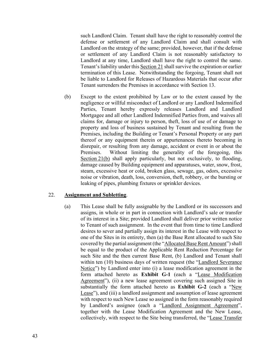 43 such Landlord Claim. Tenant shall have the right to reasonably control the defense or settlement of any Landlord Claim and shall consult with Landlord on the strategy of the same; provided, however, that if the defense or settlement of any Landlord Claim is not reasonably satisfactory to Landlord at any time, Landlord shall have the right to control the same. Tenant’s liability under this Section 21 shall survive the expiration or earlier termination of this Lease. Notwithstanding the forgoing, Tenant shall not be liable to Landlord for Releases of Hazardous Materials that occur after Tenant surrenders the Premises in accordance with Section 13. (b) Except to the extent prohibited by Law or to the extent caused by the negligence or willful misconduct of Landlord or any Landlord Indemnified Parties, Tenant hereby expressly releases Landlord and Landlord Mortgagee and all other Landlord Indemnified Parties from, and waives all claims for, damage or injury to person, theft, loss of use of or damage to property and loss of business sustained by Tenant and resulting from the Premises, including the Building or Tenant’s Personal Property or any part thereof or any equipment therein or appurtenances thereto becoming in disrepair, or resulting from any damage, accident or event in or about the Premises. Without limiting the generality of the foregoing, this Section 21(b) shall apply particularly, but not exclusively, to flooding, damage caused by Building equipment and apparatuses, water, snow, frost, steam, excessive heat or cold, broken glass, sewage, gas, odors, excessive noise or vibration, death, loss, conversion, theft, robbery, or the bursting or leaking of pipes, plumbing fixtures or sprinkler devices. 22. Assignment and Subletting. (a) This Lease shall be fully assignable by the Landlord or its successors and assigns, in whole or in part in connection with Landlord’s sale or transfer of its interest in a Site; provided Landlord shall deliver prior written notice to Tenant of such assignment. In the event that from time to time Landlord desires to sever and partially assign its interest in the Lease with respect to one of the Sites in its entirety, then (a) the Base Rent allocated to such Site covered by the partial assignment (the “Allocated Base Rent Amount”) shall be equal to the product of the Applicable Rent Reduction Percentage for such Site and the then current Base Rent, (b) Landlord and Tenant shall within ten (10) business days of written request (the “Landlord Severance Notice”) by Landlord enter into (i) a lease modification agreement in the form attached hereto as Exhibit G-1 (each a “Lease Modification Agreement”), (ii) a new lease agreement covering such assigned Site in substantially the form attached hereto as Exhibit G-2 (each a “New Lease”), and (iii) a landlord assignment and assumption of lease agreement with respect to such New Lease so assigned in the form reasonably required by Landlord’s assignee (each a “Landlord Assignment Agreement”, together with the Lease Modification Agreement and the New Lease, collectively, with respect to the Site being transferred, the “Lease Transfer