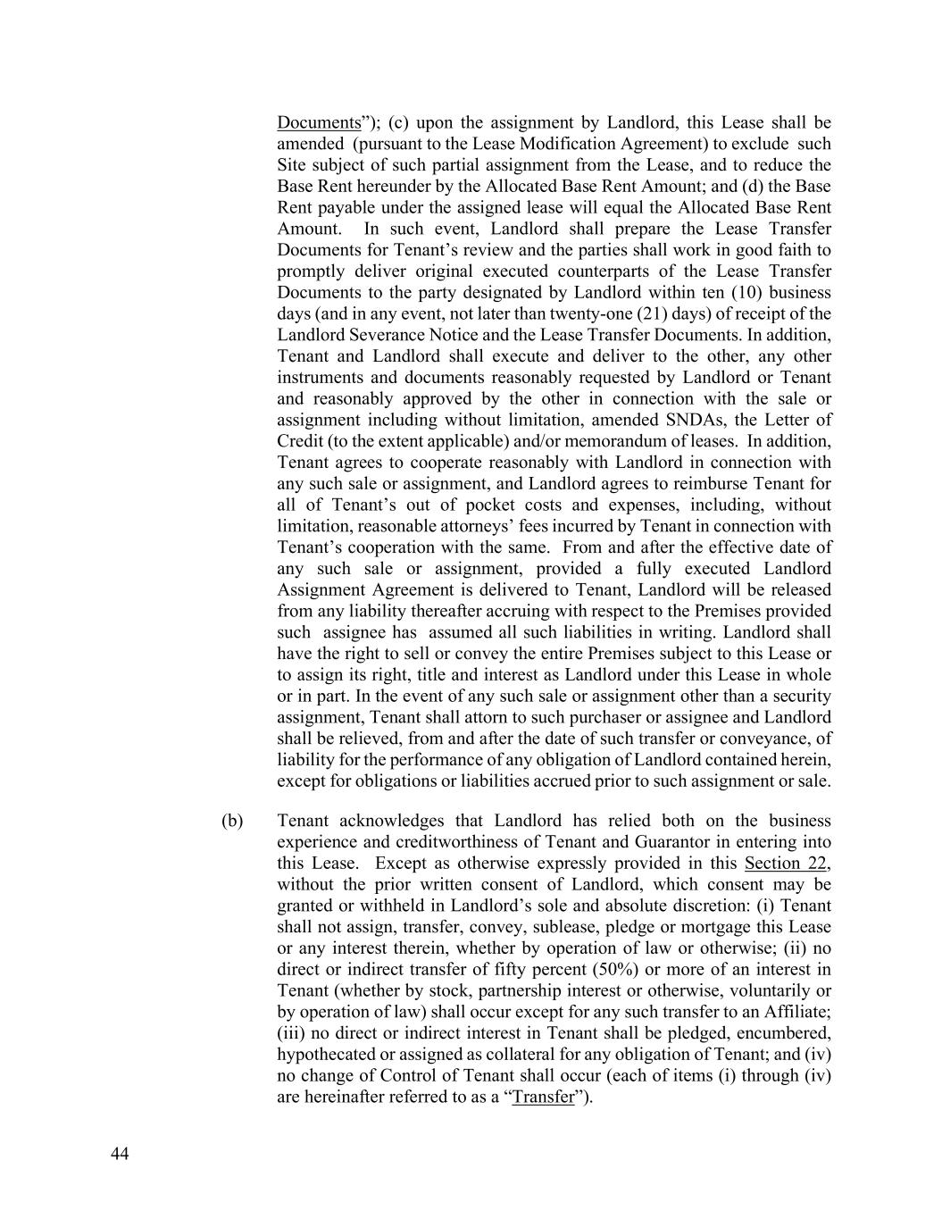 44 Documents”); (c) upon the assignment by Landlord, this Lease shall be amended (pursuant to the Lease Modification Agreement) to exclude such Site subject of such partial assignment from the Lease, and to reduce the Base Rent hereunder by the Allocated Base Rent Amount; and (d) the Base Rent payable under the assigned lease will equal the Allocated Base Rent Amount. In such event, Landlord shall prepare the Lease Transfer Documents for Tenant’s review and the parties shall work in good faith to promptly deliver original executed counterparts of the Lease Transfer Documents to the party designated by Landlord within ten (10) business days (and in any event, not later than twenty-one (21) days) of receipt of the Landlord Severance Notice and the Lease Transfer Documents. In addition, Tenant and Landlord shall execute and deliver to the other, any other instruments and documents reasonably requested by Landlord or Tenant and reasonably approved by the other in connection with the sale or assignment including without limitation, amended SNDAs, the Letter of Credit (to the extent applicable) and/or memorandum of leases. In addition, Tenant agrees to cooperate reasonably with Landlord in connection with any such sale or assignment, and Landlord agrees to reimburse Tenant for all of Tenant’s out of pocket costs and expenses, including, without limitation, reasonable attorneys’ fees incurred by Tenant in connection with Tenant’s cooperation with the same. From and after the effective date of any such sale or assignment, provided a fully executed Landlord Assignment Agreement is delivered to Tenant, Landlord will be released from any liability thereafter accruing with respect to the Premises provided such assignee has assumed all such liabilities in writing. Landlord shall have the right to sell or convey the entire Premises subject to this Lease or to assign its right, title and interest as Landlord under this Lease in whole or in part. In the event of any such sale or assignment other than a security assignment, Tenant shall attorn to such purchaser or assignee and Landlord shall be relieved, from and after the date of such transfer or conveyance, of liability for the performance of any obligation of Landlord contained herein, except for obligations or liabilities accrued prior to such assignment or sale. (b) Tenant acknowledges that Landlord has relied both on the business experience and creditworthiness of Tenant and Guarantor in entering into this Lease. Except as otherwise expressly provided in this Section 22, without the prior written consent of Landlord, which consent may be granted or withheld in Landlord’s sole and absolute discretion: (i) Tenant shall not assign, transfer, convey, sublease, pledge or mortgage this Lease or any interest therein, whether by operation of law or otherwise; (ii) no direct or indirect transfer of fifty percent (50%) or more of an interest in Tenant (whether by stock, partnership interest or otherwise, voluntarily or by operation of law) shall occur except for any such transfer to an Affiliate; (iii) no direct or indirect interest in Tenant shall be pledged, encumbered, hypothecated or assigned as collateral for any obligation of Tenant; and (iv) no change of Control of Tenant shall occur (each of items (i) through (iv) are hereinafter referred to as a “Transfer”).