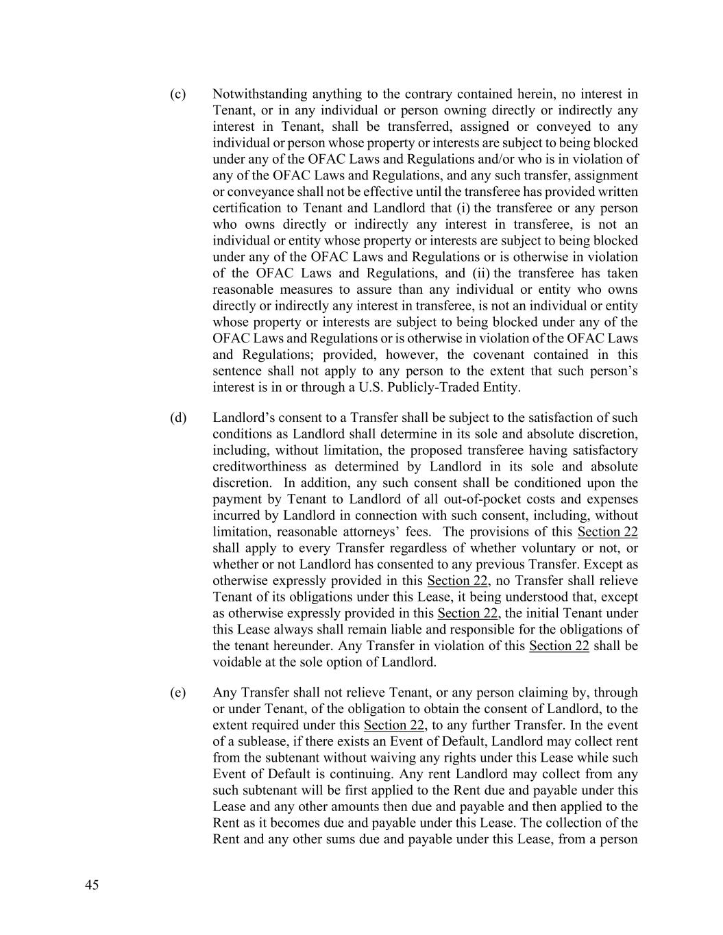 45 (c) Notwithstanding anything to the contrary contained herein, no interest in Tenant, or in any individual or person owning directly or indirectly any interest in Tenant, shall be transferred, assigned or conveyed to any individual or person whose property or interests are subject to being blocked under any of the OFAC Laws and Regulations and/or who is in violation of any of the OFAC Laws and Regulations, and any such transfer, assignment or conveyance shall not be effective until the transferee has provided written certification to Tenant and Landlord that (i) the transferee or any person who owns directly or indirectly any interest in transferee, is not an individual or entity whose property or interests are subject to being blocked under any of the OFAC Laws and Regulations or is otherwise in violation of the OFAC Laws and Regulations, and (ii) the transferee has taken reasonable measures to assure than any individual or entity who owns directly or indirectly any interest in transferee, is not an individual or entity whose property or interests are subject to being blocked under any of the OFAC Laws and Regulations or is otherwise in violation of the OFAC Laws and Regulations; provided, however, the covenant contained in this sentence shall not apply to any person to the extent that such person’s interest is in or through a U.S. Publicly-Traded Entity. (d) Landlord’s consent to a Transfer shall be subject to the satisfaction of such conditions as Landlord shall determine in its sole and absolute discretion, including, without limitation, the proposed transferee having satisfactory creditworthiness as determined by Landlord in its sole and absolute discretion. In addition, any such consent shall be conditioned upon the payment by Tenant to Landlord of all out-of-pocket costs and expenses incurred by Landlord in connection with such consent, including, without limitation, reasonable attorneys’ fees. The provisions of this Section 22 shall apply to every Transfer regardless of whether voluntary or not, or whether or not Landlord has consented to any previous Transfer. Except as otherwise expressly provided in this Section 22, no Transfer shall relieve Tenant of its obligations under this Lease, it being understood that, except as otherwise expressly provided in this Section 22, the initial Tenant under this Lease always shall remain liable and responsible for the obligations of the tenant hereunder. Any Transfer in violation of this Section 22 shall be voidable at the sole option of Landlord. (e) Any Transfer shall not relieve Tenant, or any person claiming by, through or under Tenant, of the obligation to obtain the consent of Landlord, to the extent required under this Section 22, to any further Transfer. In the event of a sublease, if there exists an Event of Default, Landlord may collect rent from the subtenant without waiving any rights under this Lease while such Event of Default is continuing. Any rent Landlord may collect from any such subtenant will be first applied to the Rent due and payable under this Lease and any other amounts then due and payable and then applied to the Rent as it becomes due and payable under this Lease. The collection of the Rent and any other sums due and payable under this Lease, from a person