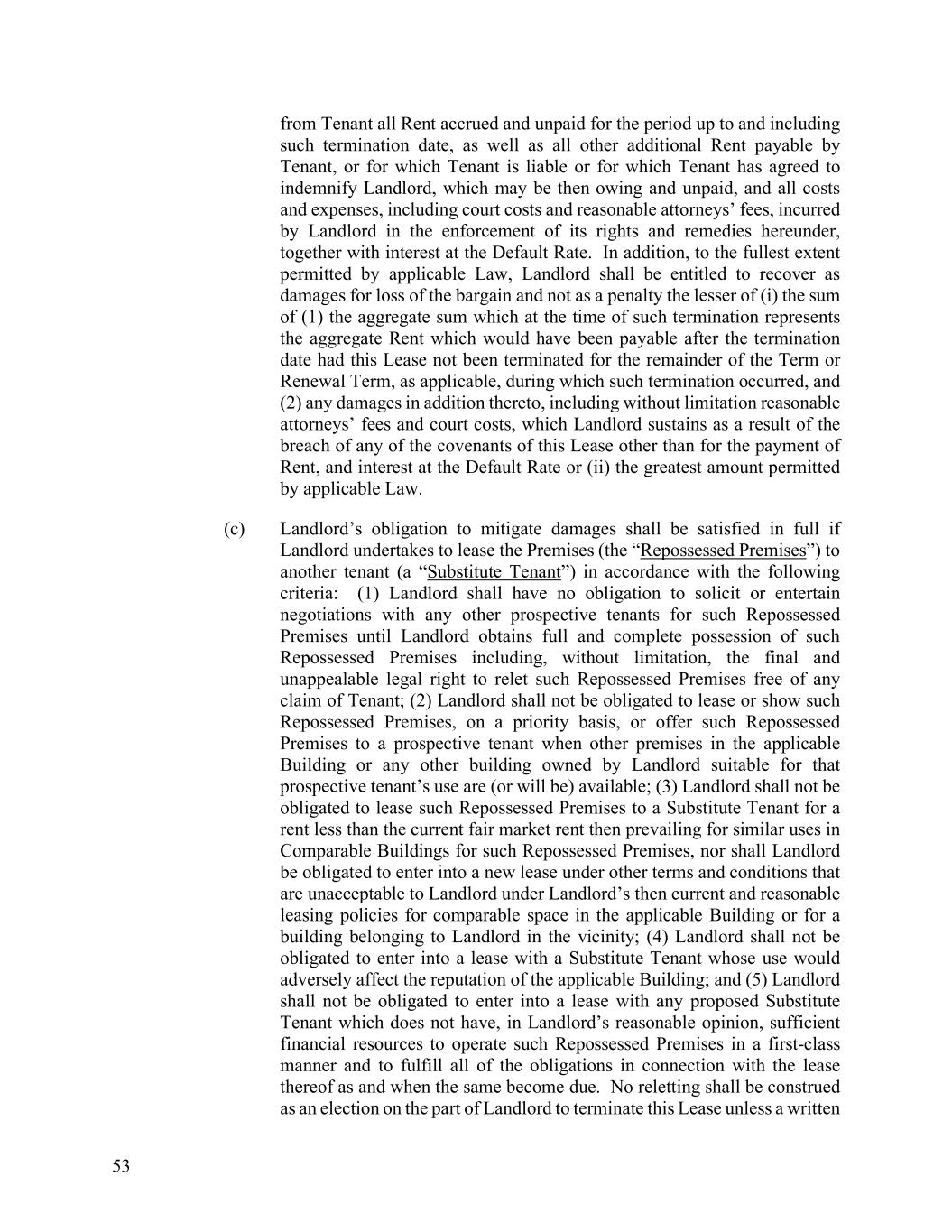 53 from Tenant all Rent accrued and unpaid for the period up to and including such termination date, as well as all other additional Rent payable by Tenant, or for which Tenant is liable or for which Tenant has agreed to indemnify Landlord, which may be then owing and unpaid, and all costs and expenses, including court costs and reasonable attorneys’ fees, incurred by Landlord in the enforcement of its rights and remedies hereunder, together with interest at the Default Rate. In addition, to the fullest extent permitted by applicable Law, Landlord shall be entitled to recover as damages for loss of the bargain and not as a penalty the lesser of (i) the sum of (1) the aggregate sum which at the time of such termination represents the aggregate Rent which would have been payable after the termination date had this Lease not been terminated for the remainder of the Term or Renewal Term, as applicable, during which such termination occurred, and (2) any damages in addition thereto, including without limitation reasonable attorneys’ fees and court costs, which Landlord sustains as a result of the breach of any of the covenants of this Lease other than for the payment of Rent, and interest at the Default Rate or (ii) the greatest amount permitted by applicable Law. (c) Landlord’s obligation to mitigate damages shall be satisfied in full if Landlord undertakes to lease the Premises (the “Repossessed Premises”) to another tenant (a “Substitute Tenant”) in accordance with the following criteria: (1) Landlord shall have no obligation to solicit or entertain negotiations with any other prospective tenants for such Repossessed Premises until Landlord obtains full and complete possession of such Repossessed Premises including, without limitation, the final and unappealable legal right to relet such Repossessed Premises free of any claim of Tenant; (2) Landlord shall not be obligated to lease or show such Repossessed Premises, on a priority basis, or offer such Repossessed Premises to a prospective tenant when other premises in the applicable Building or any other building owned by Landlord suitable for that prospective tenant’s use are (or will be) available; (3) Landlord shall not be obligated to lease such Repossessed Premises to a Substitute Tenant for a rent less than the current fair market rent then prevailing for similar uses in Comparable Buildings for such Repossessed Premises, nor shall Landlord be obligated to enter into a new lease under other terms and conditions that are unacceptable to Landlord under Landlord’s then current and reasonable leasing policies for comparable space in the applicable Building or for a building belonging to Landlord in the vicinity; (4) Landlord shall not be obligated to enter into a lease with a Substitute Tenant whose use would adversely affect the reputation of the applicable Building; and (5) Landlord shall not be obligated to enter into a lease with any proposed Substitute Tenant which does not have, in Landlord’s reasonable opinion, sufficient financial resources to operate such Repossessed Premises in a first-class manner and to fulfill all of the obligations in connection with the lease thereof as and when the same become due. No reletting shall be construed as an election on the part of Landlord to terminate this Lease unless a written