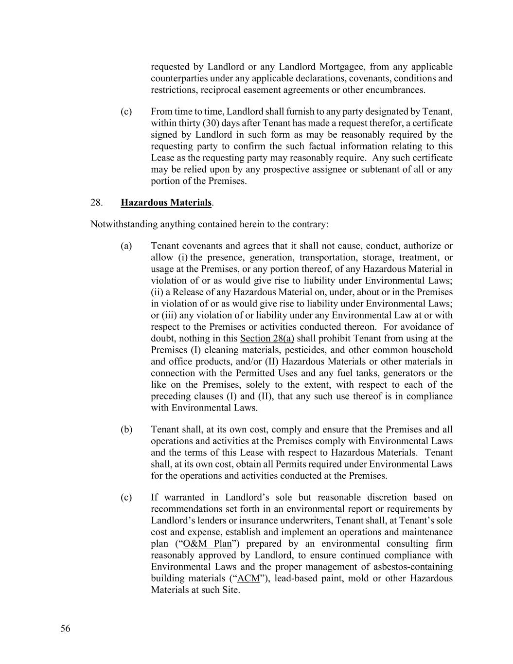 56 requested by Landlord or any Landlord Mortgagee, from any applicable counterparties under any applicable declarations, covenants, conditions and restrictions, reciprocal easement agreements or other encumbrances. (c) From time to time, Landlord shall furnish to any party designated by Tenant, within thirty (30) days after Tenant has made a request therefor, a certificate signed by Landlord in such form as may be reasonably required by the requesting party to confirm the such factual information relating to this Lease as the requesting party may reasonably require. Any such certificate may be relied upon by any prospective assignee or subtenant of all or any portion of the Premises. 28. Hazardous Materials. Notwithstanding anything contained herein to the contrary: (a) Tenant covenants and agrees that it shall not cause, conduct, authorize or allow (i) the presence, generation, transportation, storage, treatment, or usage at the Premises, or any portion thereof, of any Hazardous Material in violation of or as would give rise to liability under Environmental Laws; (ii) a Release of any Hazardous Material on, under, about or in the Premises in violation of or as would give rise to liability under Environmental Laws; or (iii) any violation of or liability under any Environmental Law at or with respect to the Premises or activities conducted thereon. For avoidance of doubt, nothing in this Section 28(a) shall prohibit Tenant from using at the Premises (I) cleaning materials, pesticides, and other common household and office products, and/or (II) Hazardous Materials or other materials in connection with the Permitted Uses and any fuel tanks, generators or the like on the Premises, solely to the extent, with respect to each of the preceding clauses (I) and (II), that any such use thereof is in compliance with Environmental Laws. (b) Tenant shall, at its own cost, comply and ensure that the Premises and all operations and activities at the Premises comply with Environmental Laws and the terms of this Lease with respect to Hazardous Materials. Tenant shall, at its own cost, obtain all Permits required under Environmental Laws for the operations and activities conducted at the Premises. (c) If warranted in Landlord’s sole but reasonable discretion based on recommendations set forth in an environmental report or requirements by Landlord’s lenders or insurance underwriters, Tenant shall, at Tenant’s sole cost and expense, establish and implement an operations and maintenance plan (“O&M Plan”) prepared by an environmental consulting firm reasonably approved by Landlord, to ensure continued compliance with Environmental Laws and the proper management of asbestos-containing building materials (“ACM”), lead-based paint, mold or other Hazardous Materials at such Site.